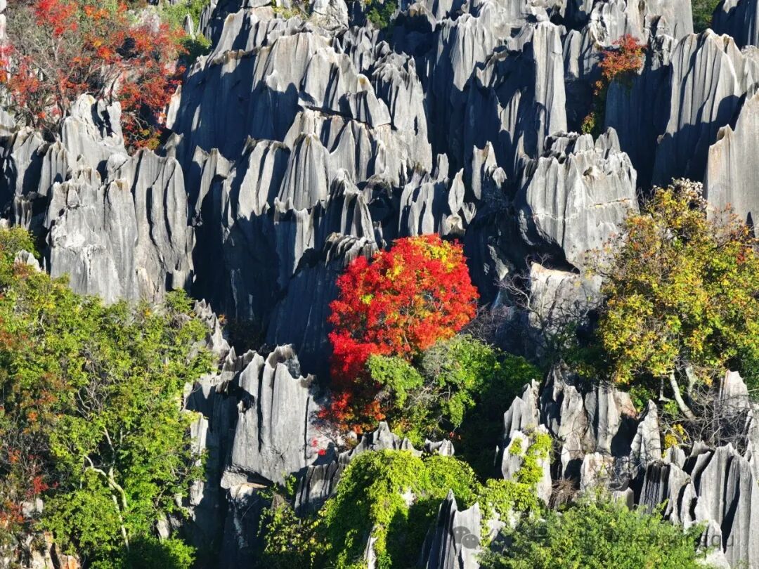 清晨的薄雾,缱绻缭绕于林立的石峰之间。巨石在雾霭的温柔摩挲下,硬朗的轮廓晕染出几分柔和与神秘的韵致。霜叶已红,严寒不浸,冬天的石林是避寒度佳的绝佳之地。