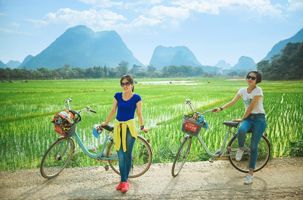 游览完芦笛岩后,沿着乡间小道一路漫步回去,乡间小路最适合游览的方式就是骑行。跟我们在阳朔游览十里画廊一样,她们也选择了骑行。