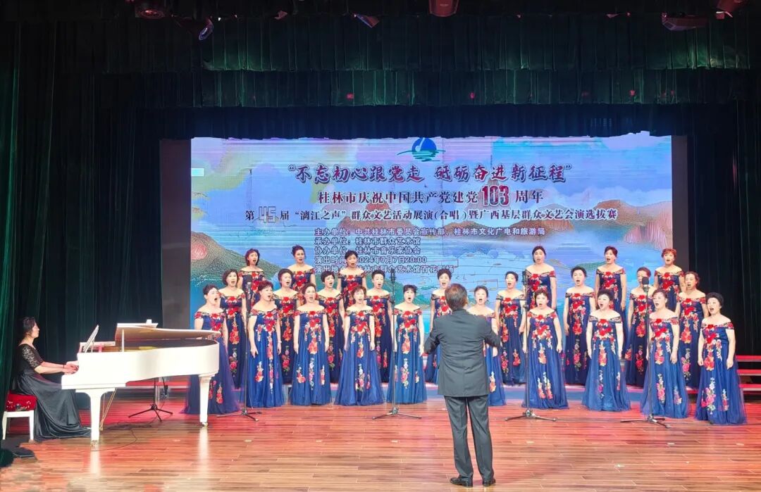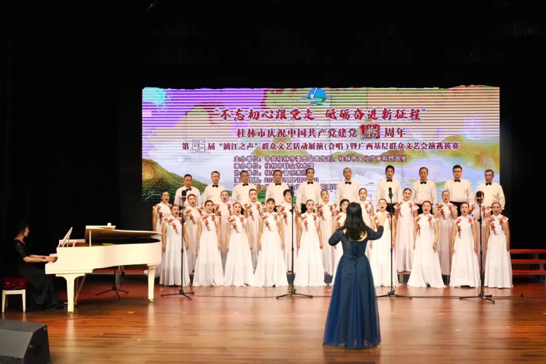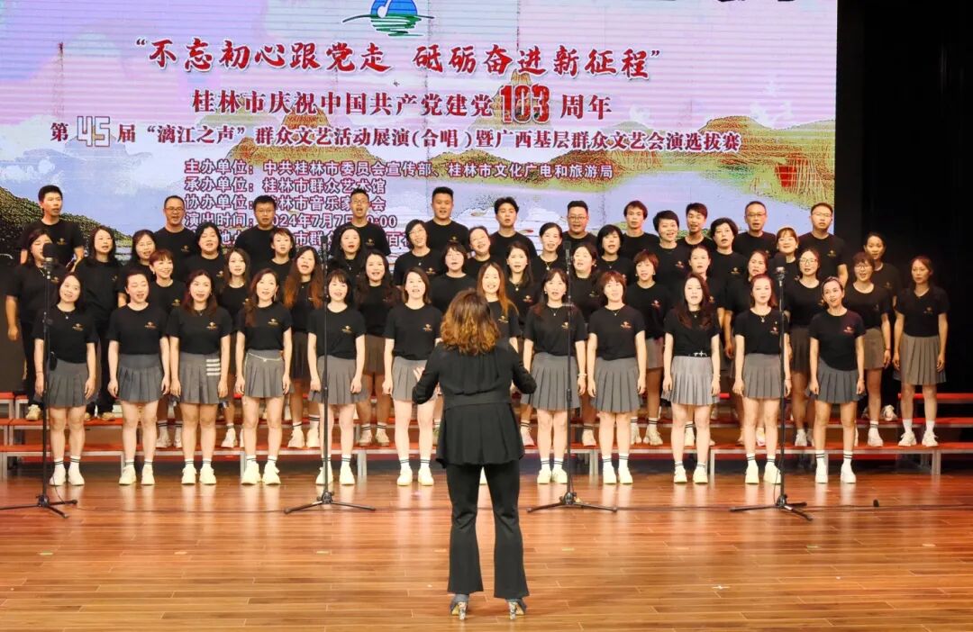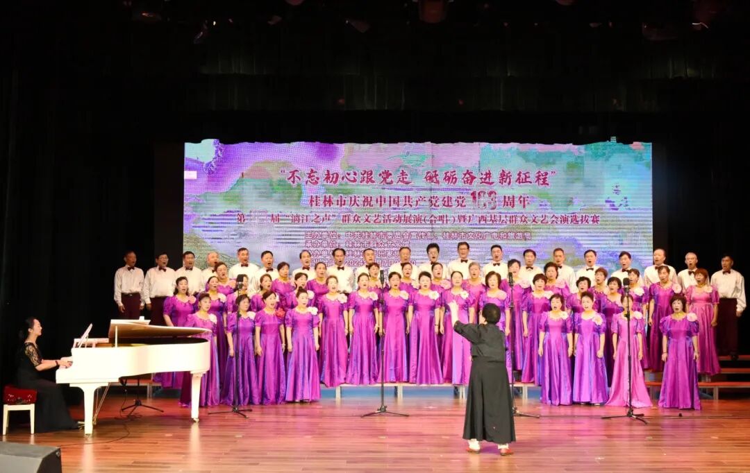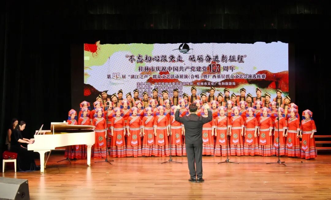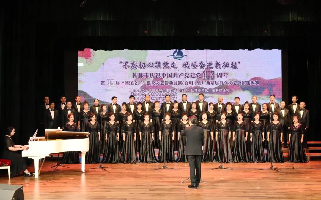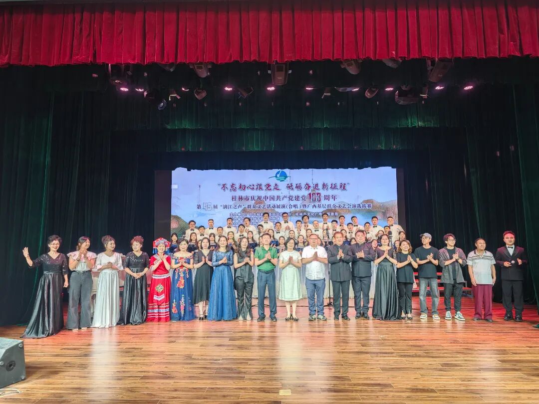 7月7日20:00,在庆祝中国共产党建党 103 周年的特殊时刻,桂林市第 45 届“漓江之声”群众文艺活动展演(合唱)暨广西基层群众文艺会演选拔赛在百花剧场隆重举行。这场以“不忘初心跟党走 砥砺奋进新征程”为主题的音乐盛会,不仅是一场震撼人心的视听盛宴,更是一座连接党心民心、传承红色基因、展现群文魅力的精神桥梁。
