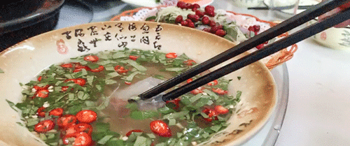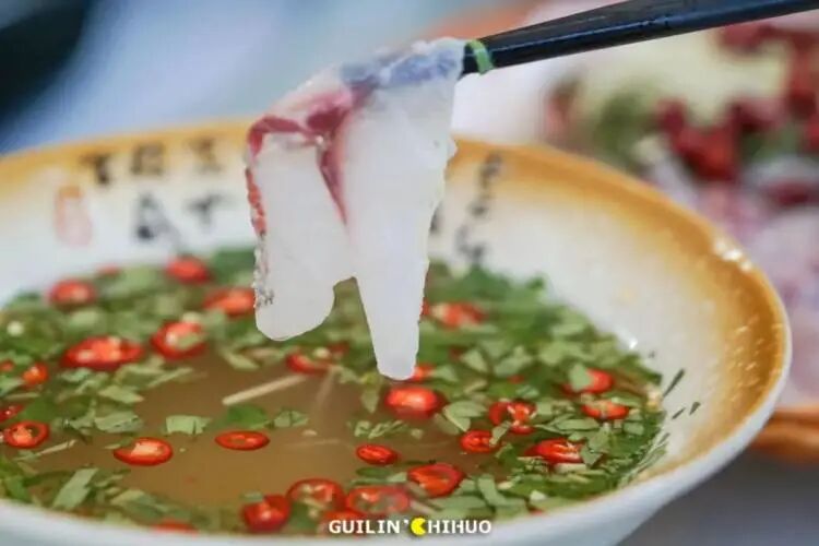 处理的透光的鱼片往特制的酸水里面一泡,颜色变白就可以吃了,入口鱼肉酸爽细嫩无骨,非常清爽。