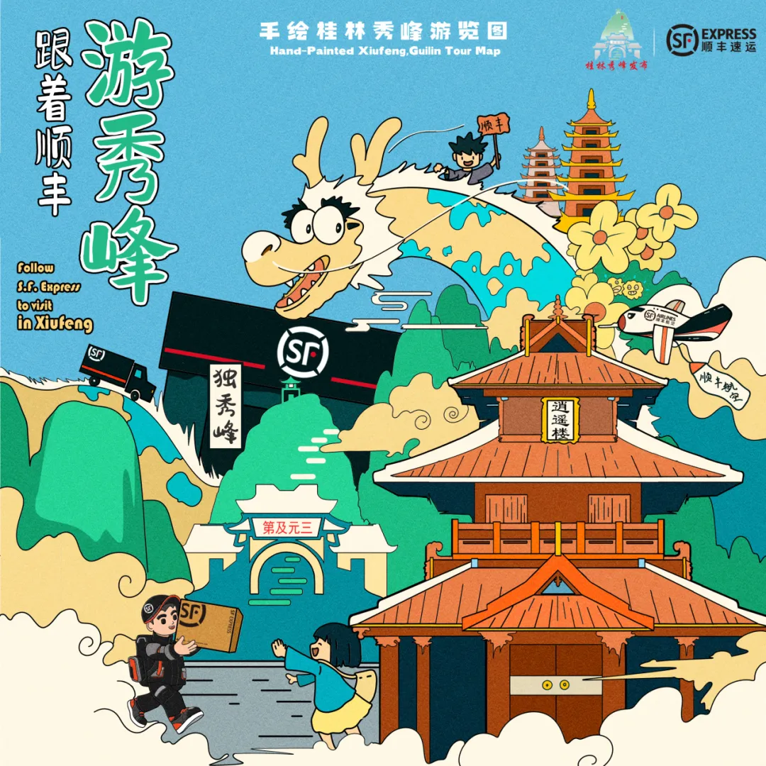 “跟着顺丰游秀峰”手绘桂林秀峰游览图是由顺丰速运推出,囊括桂林市秀峰区所辖景区景点、非遗文化、人文历史、衣食住行、休闲娱乐等多领域内容的游览图。