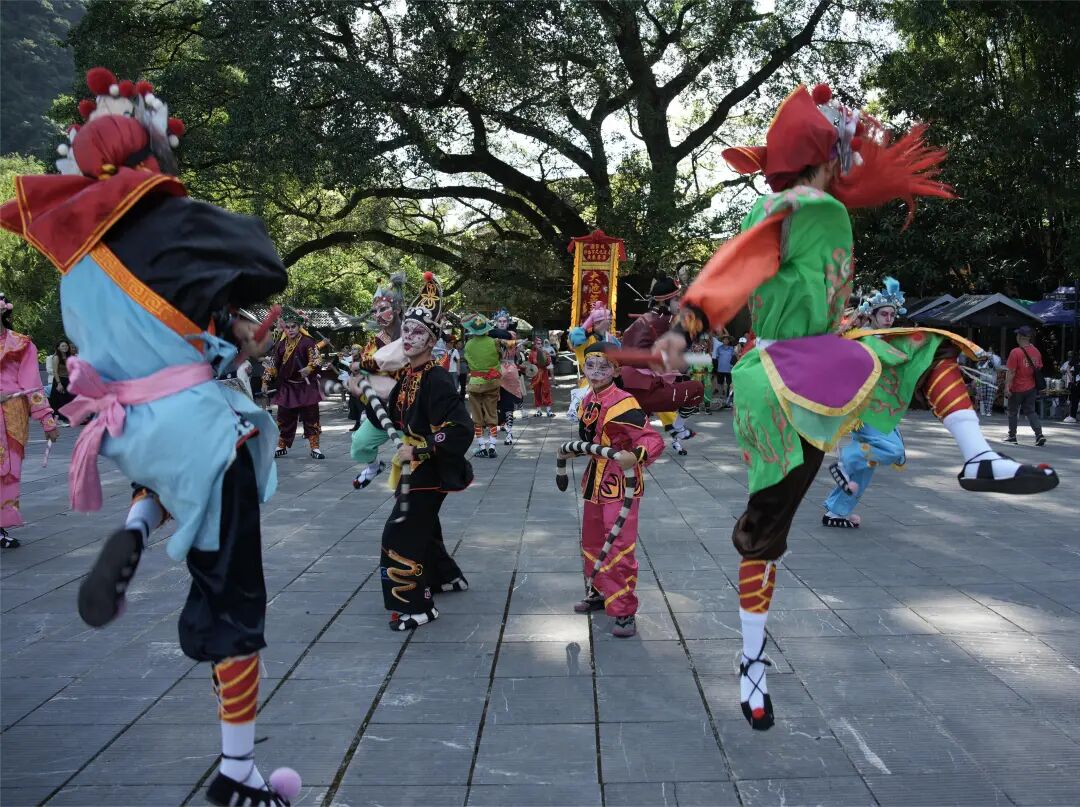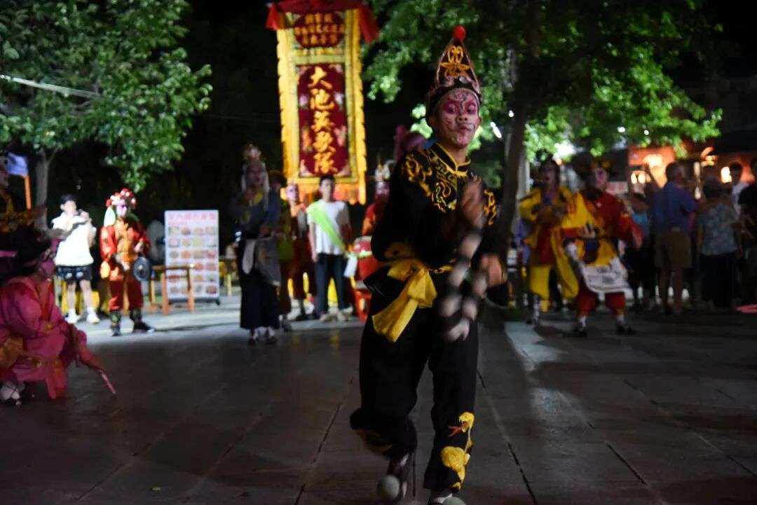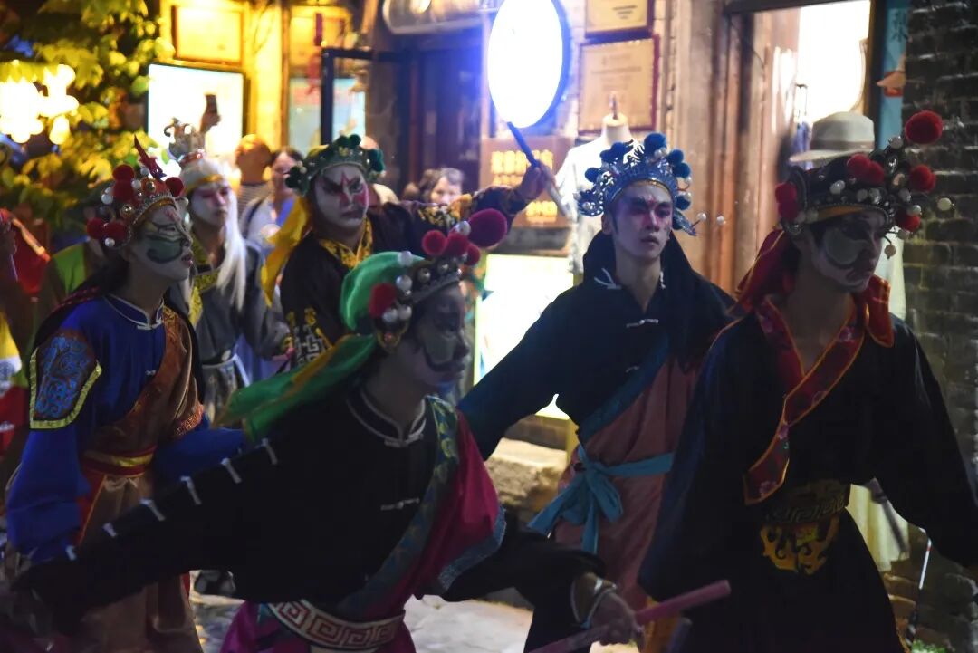 古镇搭台,非遗演出,英歌舞正与古镇的景色相得益彰,游客在道旁驻足观看,仿佛推开了时光的大门,瞥见了古镇积淀的岁月。