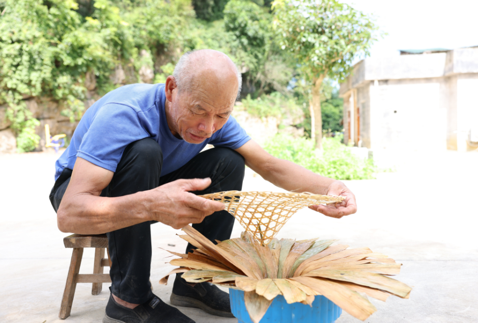 在“雨帽”村,家家户户的老人都会做雨帽,雨帽由两层竹架子加一层竹叶子组成,遮阳避雨。通讯员苏桂 摄“雨帽村”人人都会做雨帽,莫增德家也不例外,他家做雨帽的技艺已经传承三代,“雨帽是粮食短缺时期,一家人重要的收入来源。”莫增德还有六个兄弟姐妹,大家都会做雨帽,那时候,孩子们放学回家,吃完饭之后,就开始编雨帽,“孩子们不用教,看着看着就会了。”