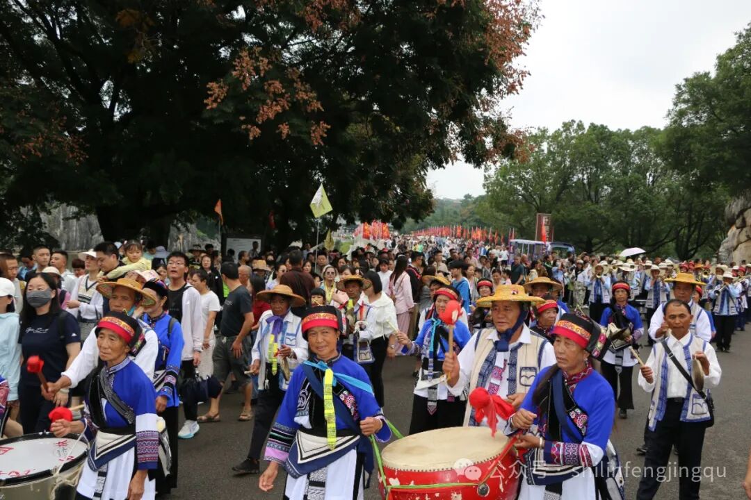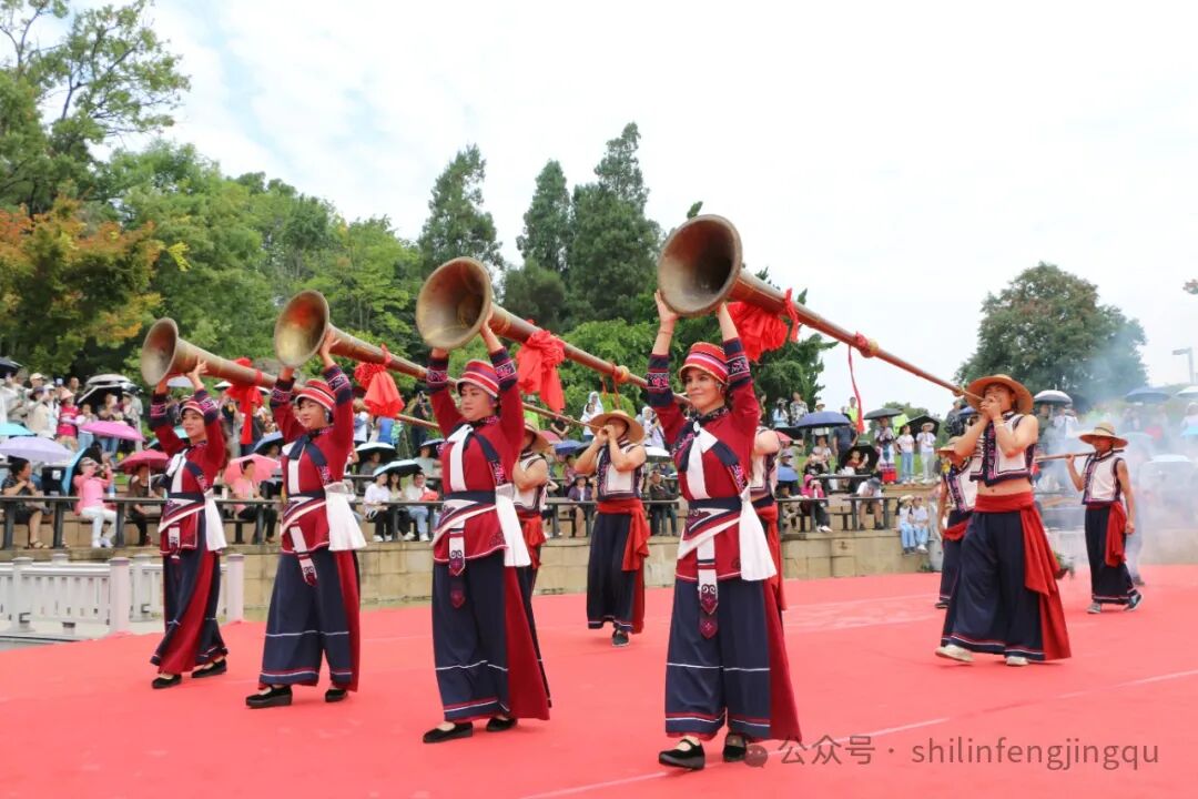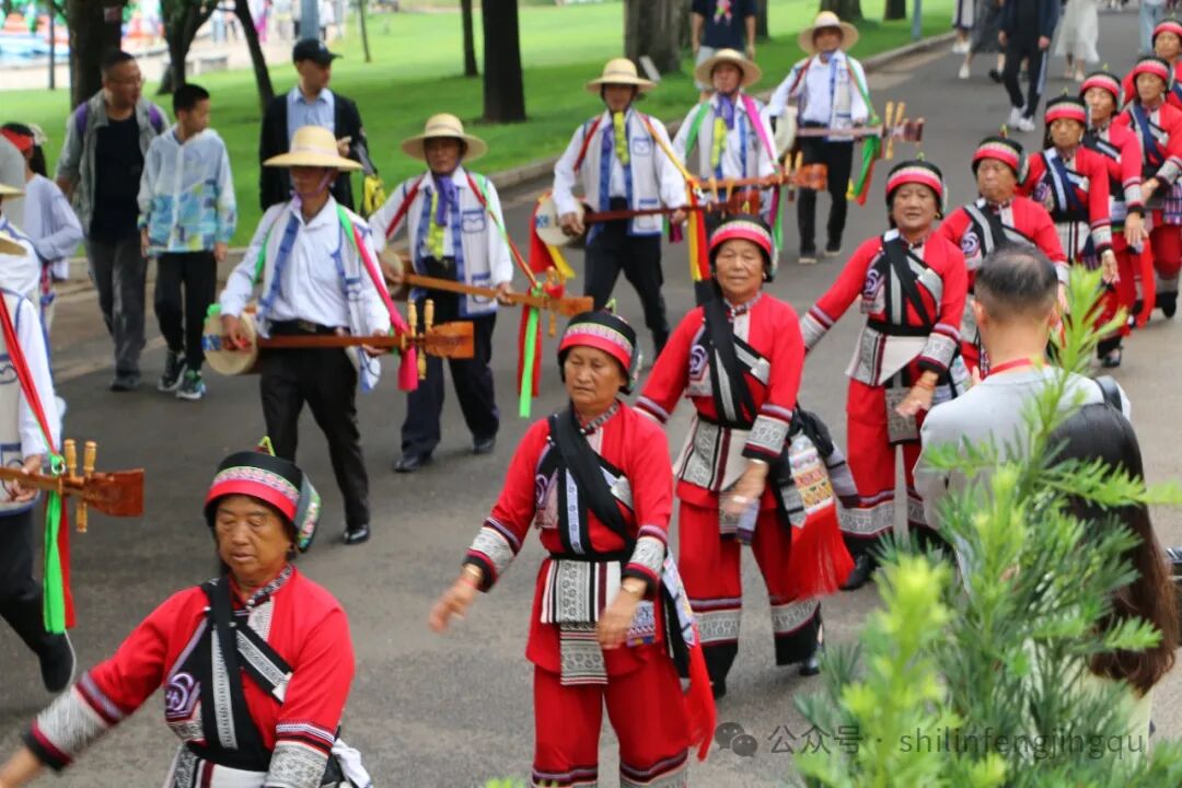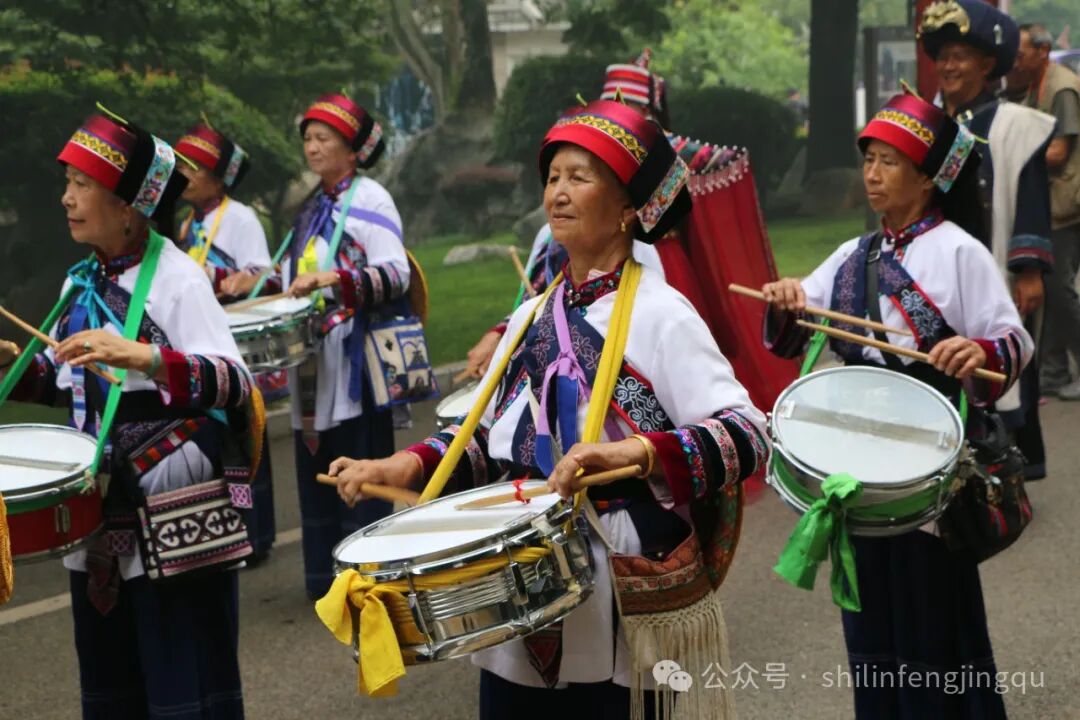 当日,景区内热闹非凡,火把节民俗巡游队伍成为了一道亮丽的风景线。过山号队那雄浑的号声率先响起,仿佛在向人们诉说着古老的故事;祈福队带着虔诚与祝福,为游客们祈求平安和幸福;阿诗玛阿黑哥队身着鲜艳的民族服饰,展现着石林彝族的独特魅力;旗幡仪仗队整齐划一,彰显着庄重与威严;鼓舞队的鼓点激昂有力,让人心潮澎湃;舞狮队的精彩表演引得观众阵阵喝彩;大三弦队的欢快旋律则让人们不禁随之舞动。巡游队伍从检票口出发,一路行至小石林出口,所到之处,充满了浓浓的节日氛围,也让游客们充分领略到了石林多彩的民族民间文化。