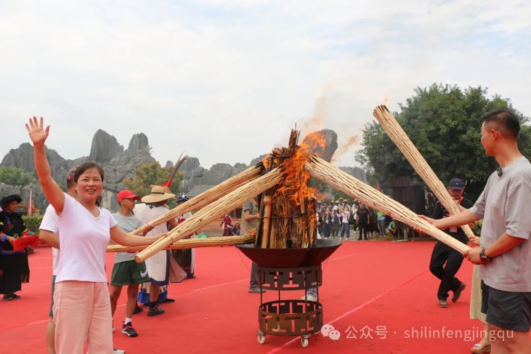篝火打跳活动将节日的欢乐气氛推向巅峰。邀请到的火把制作比赛优胜者亲手点燃了篝火,熊熊火焰映照着天空。石林艺术团和原生态表演队带领着现场游客,大家手拉手在篝火旁欢快地打跳共舞,欢歌笑语回荡在整个景区。