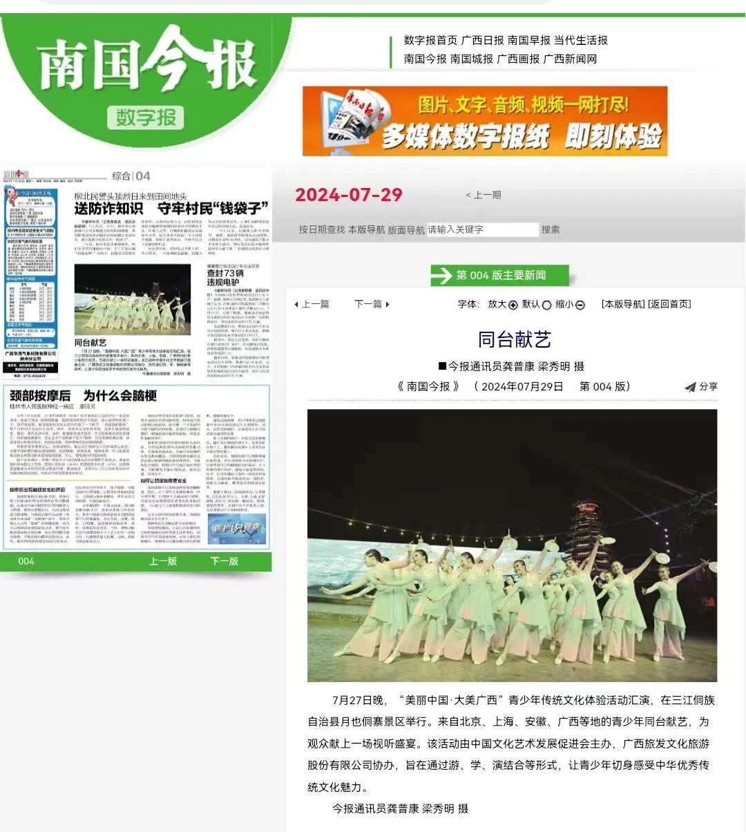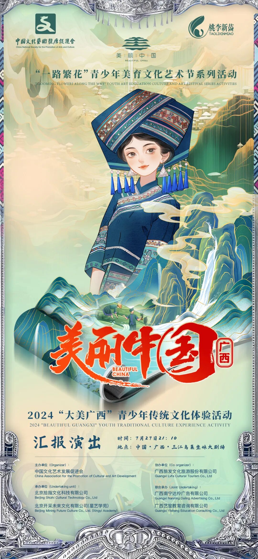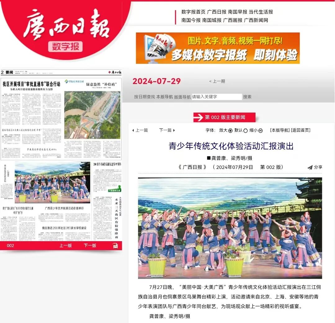 7月27日晚,“美丽中国·大美广西”青少年传统文化体验活动汇报演出在广西三江侗族自治县月也侗寨景区鸟巢舞台精彩上演,来自北京、上海、安徽、广西等地的青少年同台献艺,以歌舞、朗诵、亲子走秀、芦笙踩堂等多彩节目,为现场观众献上一场精彩绝伦的视听盛宴。