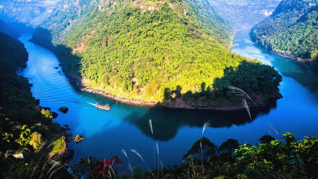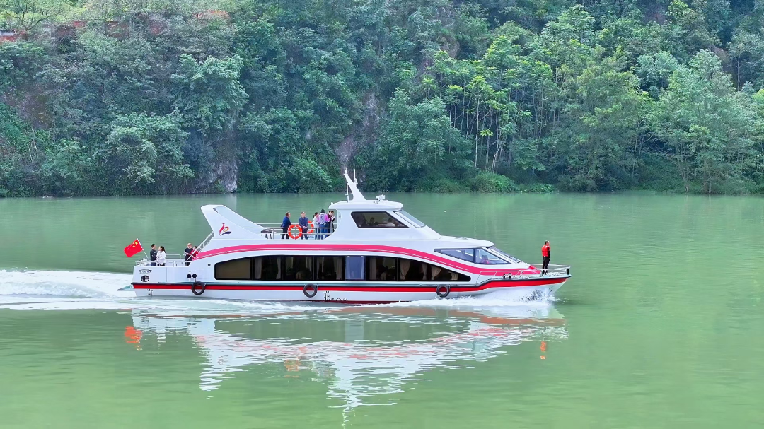 沙湾“红房子—硝斗岩”旅游航线从位于沙湾区牛石镇的红房子(灰石盆渡口)出发,乘坐“沫若号”游船自下而上,经过50分钟的游览时间,最终会到达硝斗岩(龙岩码头)。