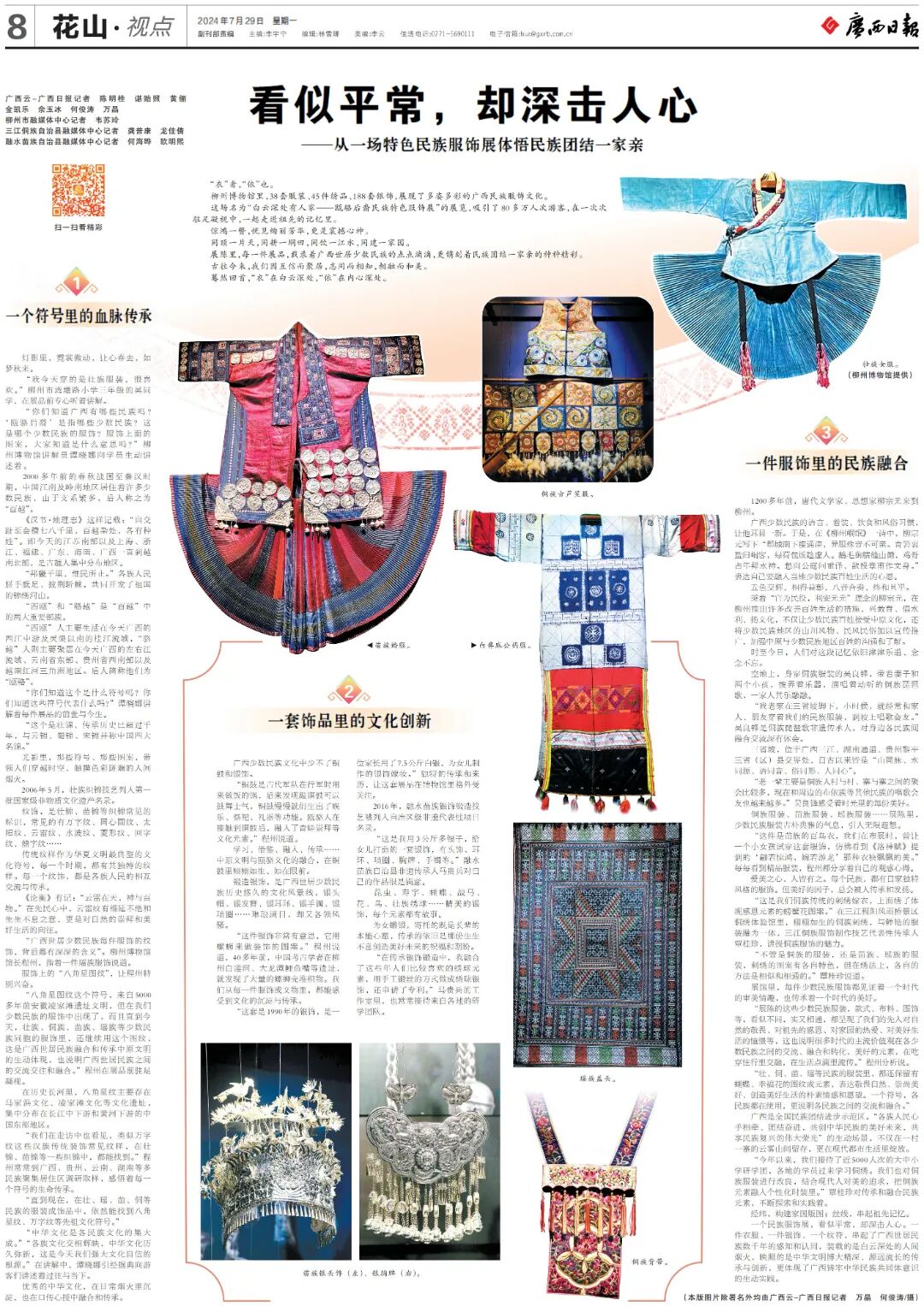 眼下,“白云深处有人家——瓯骆后裔民族特色服饰展”正在柳州博物馆展出。展览分“白云出岫来”“人在行云里”和“云深不知处”三个部分,集中展示了300多件(套)壮、苗、瑶、侗、彝、布依等瓯骆后裔民族的服饰、银饰,让广大游客通过这些“穿在身上的历史”,沉浸式感受中华民族传统文化的博大精深。