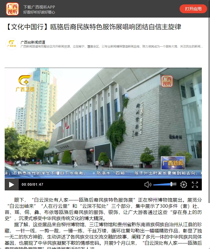 据了解,这些展品来自柳州博物馆、三江博物馆和贵州省黔东南苗族侗族自治州从江县的珍藏, 一针一线,一剪一裁,一锤一炼,千丝万缕,循环往复勾勒出一幅幅精致作品,彰显了独一无二的东方神韵,生动讲述了各民族交往交流交融的故事,阐释了多元一体的中华民族共同体基因,也展现了中华民族凝聚不散的情感密码。开展9个月以来,“白云深处有人家——瓯骆后裔民族特色服饰展”已接待游客近80万人次。
