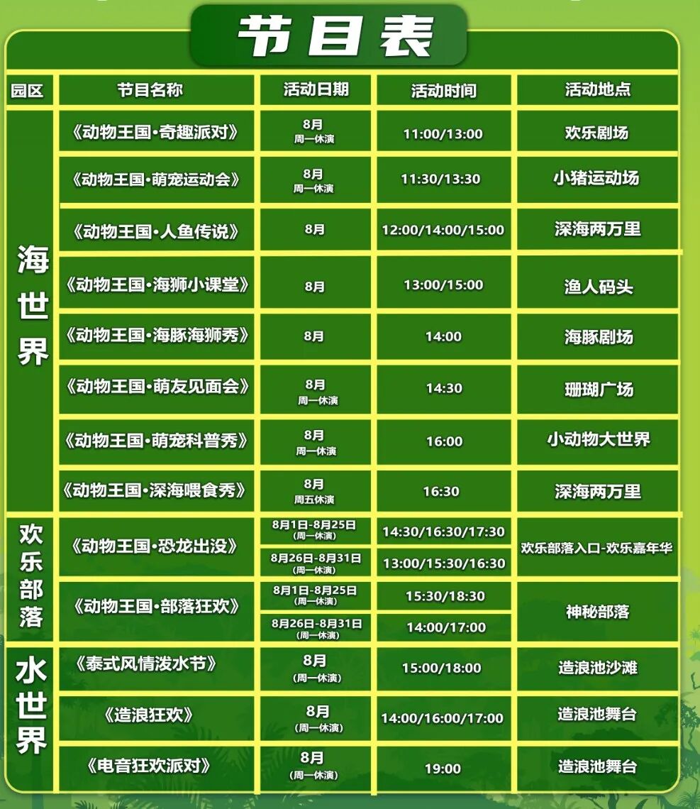 在欢乐剧场,每日将上演2场《动物王国·奇趣派对》儿童剧,欢乐的动物王国精灵们为游客现场精彩的特长表演。在海世界多场景还可观看萌宠科普秀、森林萌友巡园会等,日常王牌演艺也进行了包装升级,海豚海狮秀、海狮小课堂、人鱼传说、萌宠运动会均进行了动物王国主题包装,现场更震撼、更精彩。