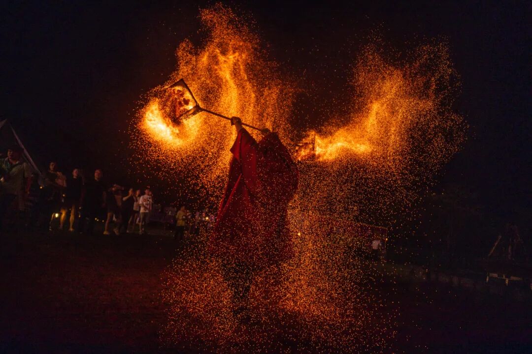 随着夜幕降临,火壶表演成为了全场的焦点。舞者们手持火壶,在空中划出一道道绚丽的火焰轨迹,每一次旋转、跳跃都凝聚着他们的汗水与激情。音乐、火焰与人群的欢呼交织在一起,构成了一幅动人心魄的画面。