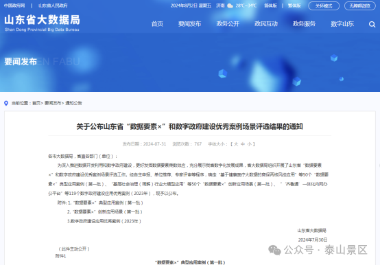 7月30日,山东省大数据局公布山东省“数据要素×”和数字政府建设优秀案例场景评选结果,“泰山景区‘智慧旅游’一站式服务提升旅游体验”成功入选“数据要素×”典型应用案例(第一批)。