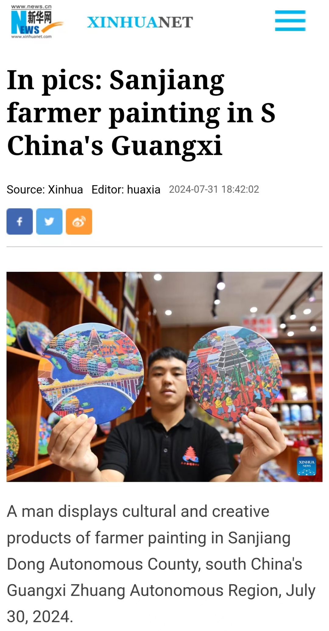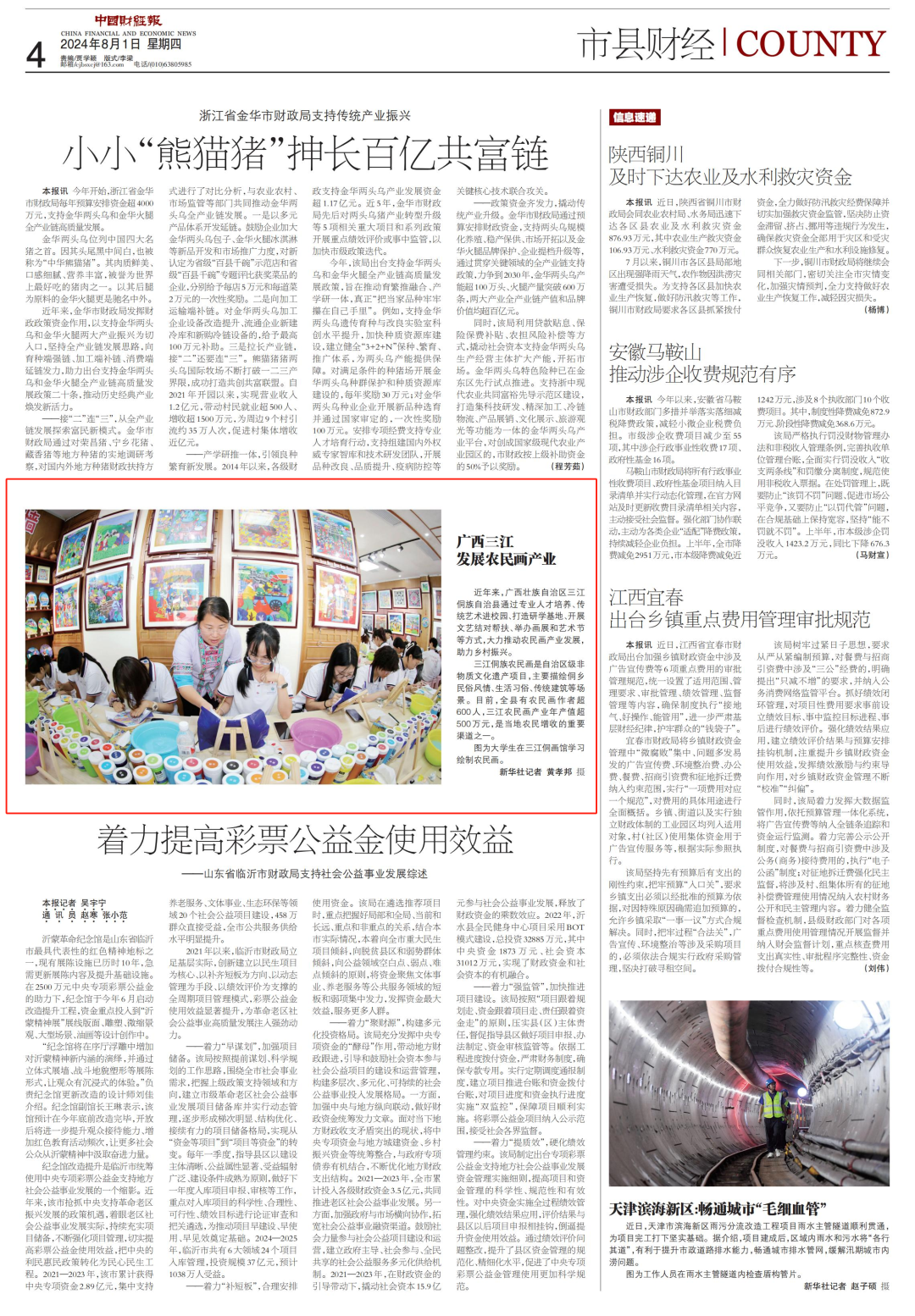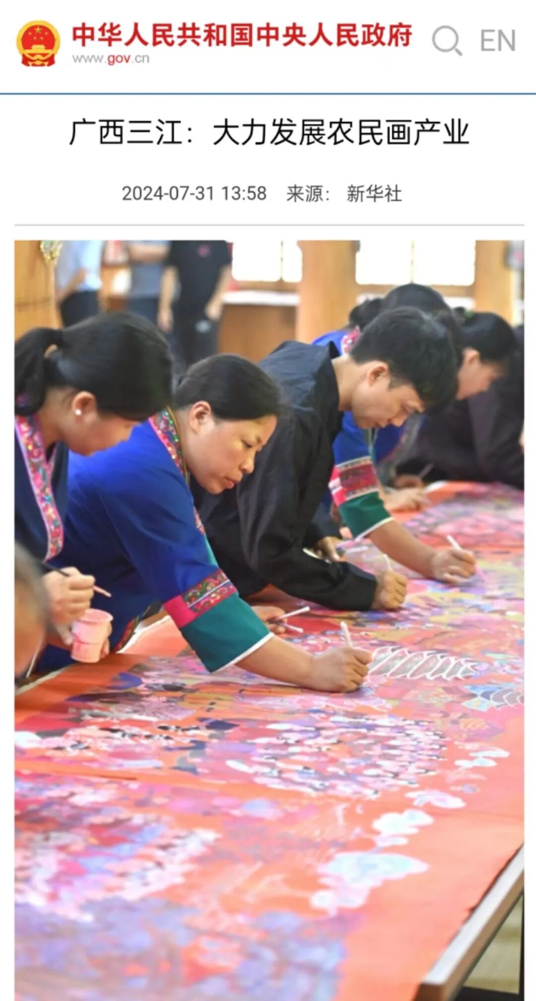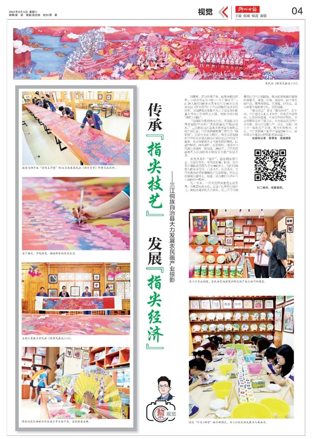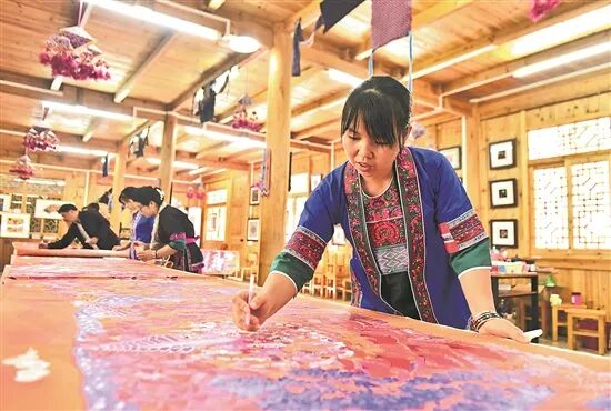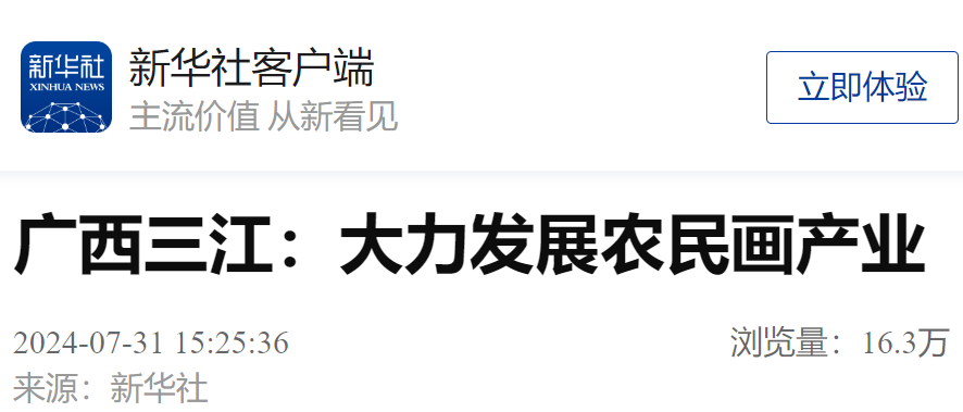 近年来,广西壮族自治区三江侗族自治县通过专业人才培养、传统艺术进校园、打造研学基地、开展文艺结对帮扶、举办画展和艺术节等方式,大力推动农民画产业发展,助力乡村振兴。三江侗族农民画是自治区级非物质文化遗产项目,主要描绘侗乡民俗风情、生活习俗、传统建筑等场景。目前,全县有农民画作者超600人,三江农民画产业年产值超500万元,是当地农民增收的重要渠道之一。
