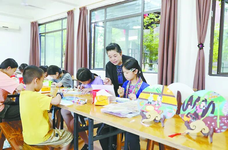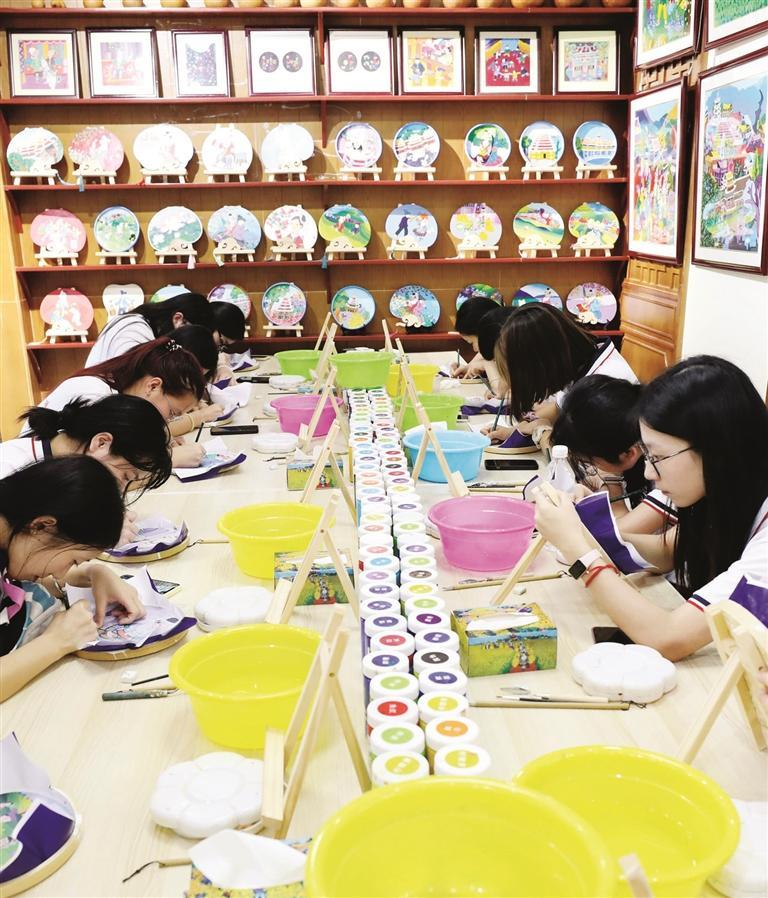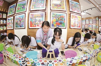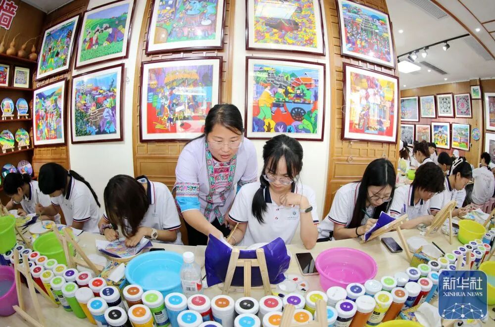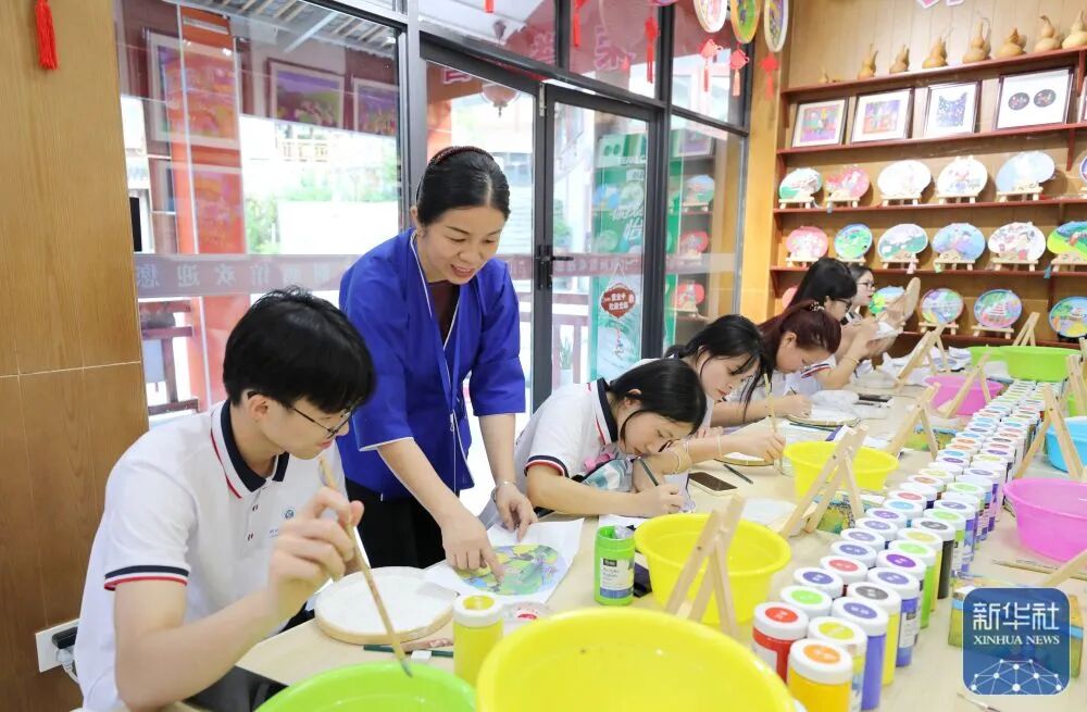 暑假期间,广西柳州三江侗族自治县依托侗族木构建筑营造技艺、三江农民画、侗族大歌、侗族刺绣等丰富的非物质文化遗产资源,探索开发系列研学课程,让学生在假期“零距离”体验非遗魅力。图为青少年学习三江农民画绘制技艺。