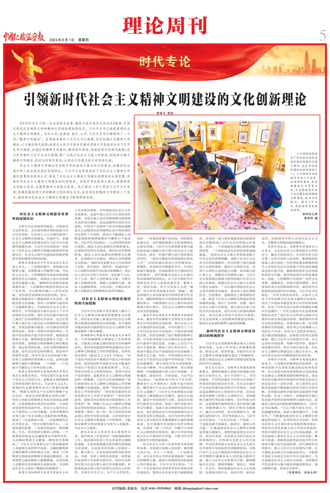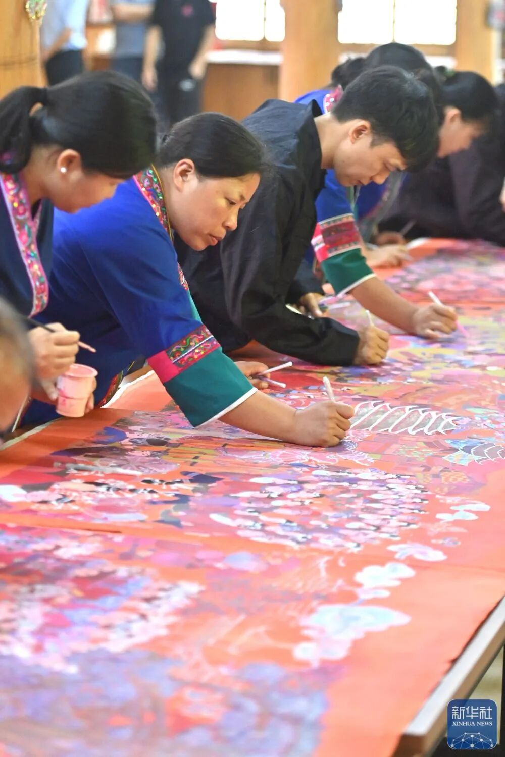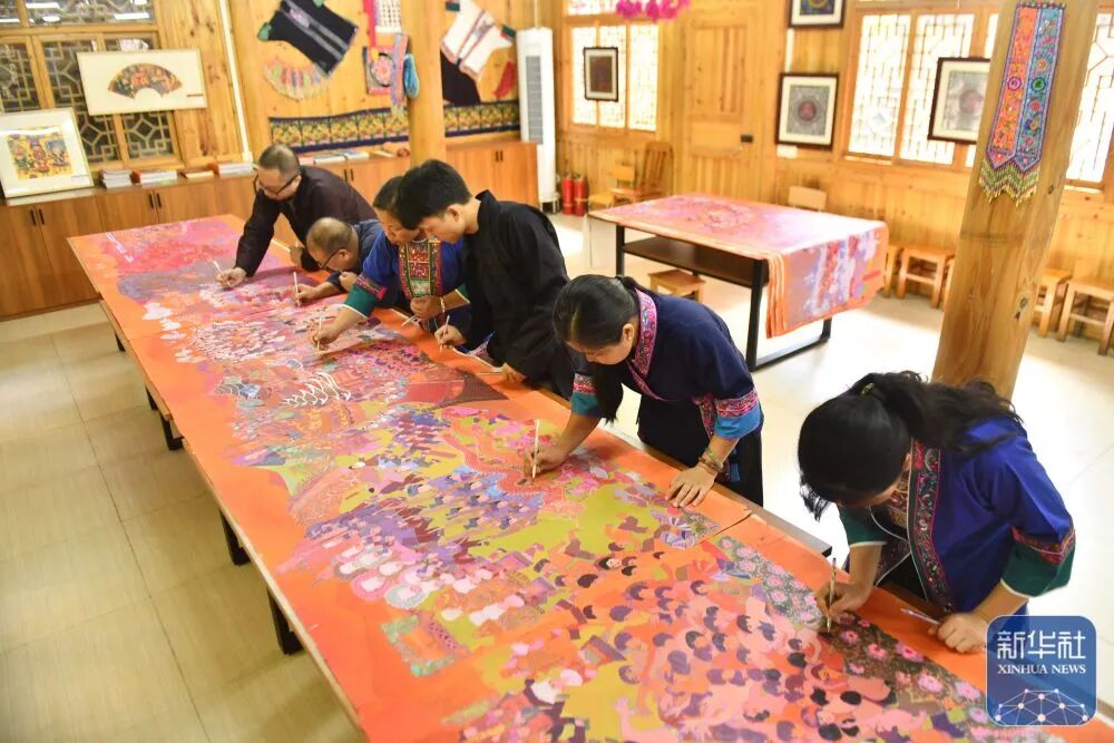 在广西三江侗族自治县民族实验学校农民画工作坊,侗族农民画作者在集体创作长卷作品《侗乡百节》(7月30日摄)。