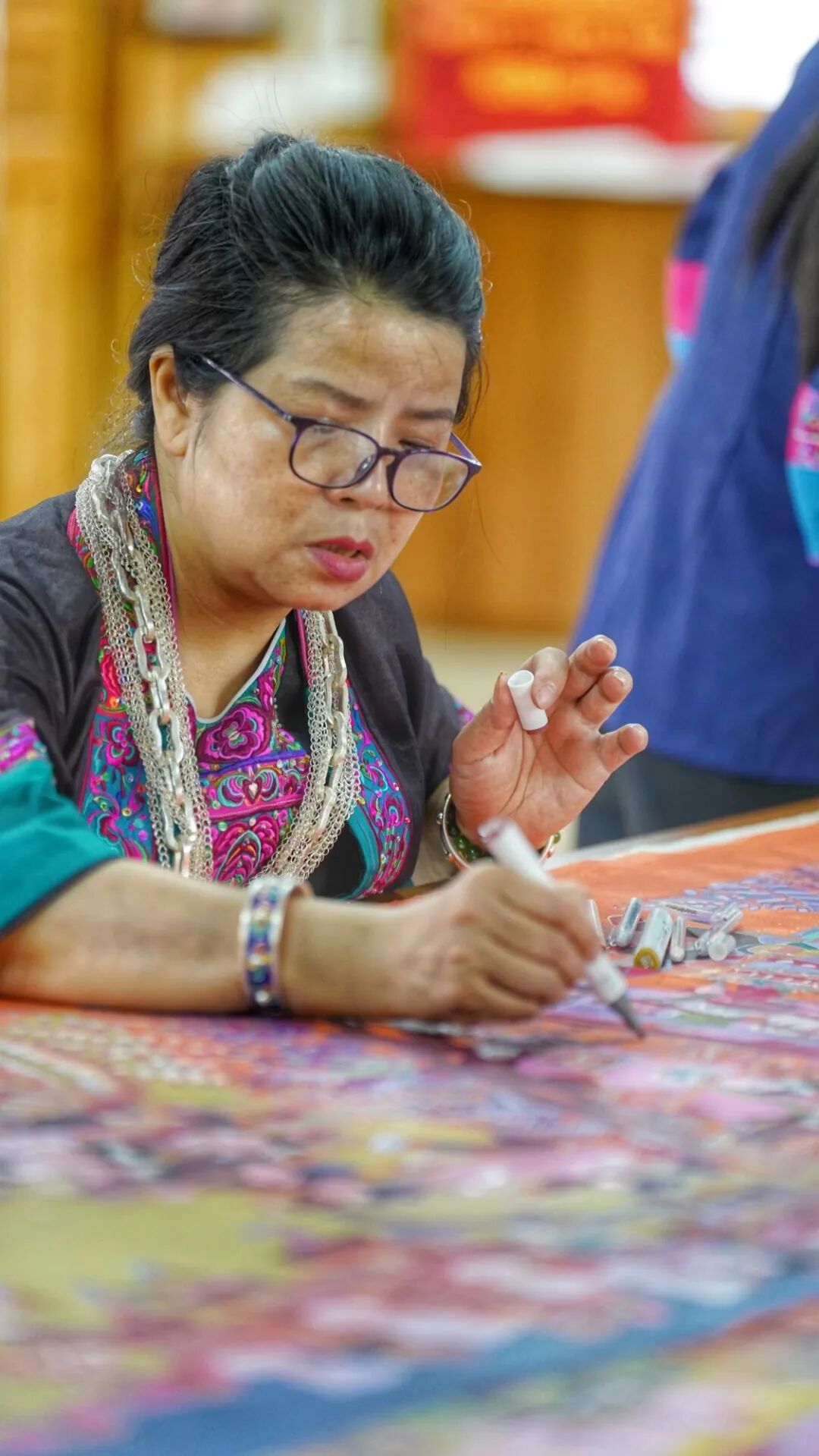 7月30日,在三江侗族自治县侗画馆,县政协委员、侗画家吴凡宇在指导侗画馆的农民画作者画侗画。吴凡宇作为侗画传承人,于2020年6月创办了侗画馆,以“公司+基地+作者(脱贫户)”等经营模式,开展三江农民画创研、培训、展示、销售等活动。近年来,该县政协通过多种方式支持政协委员积极创业,在茶叶产业、油茶产业、文化旅游产业等方面发挥政协委员优势,鼓励政协委员积极投身到乡村振兴、科教振兴、产业振兴中来。