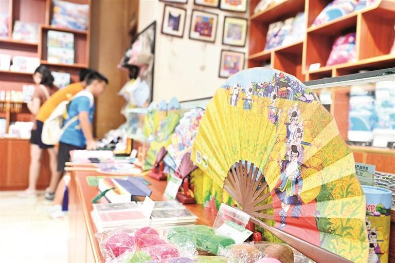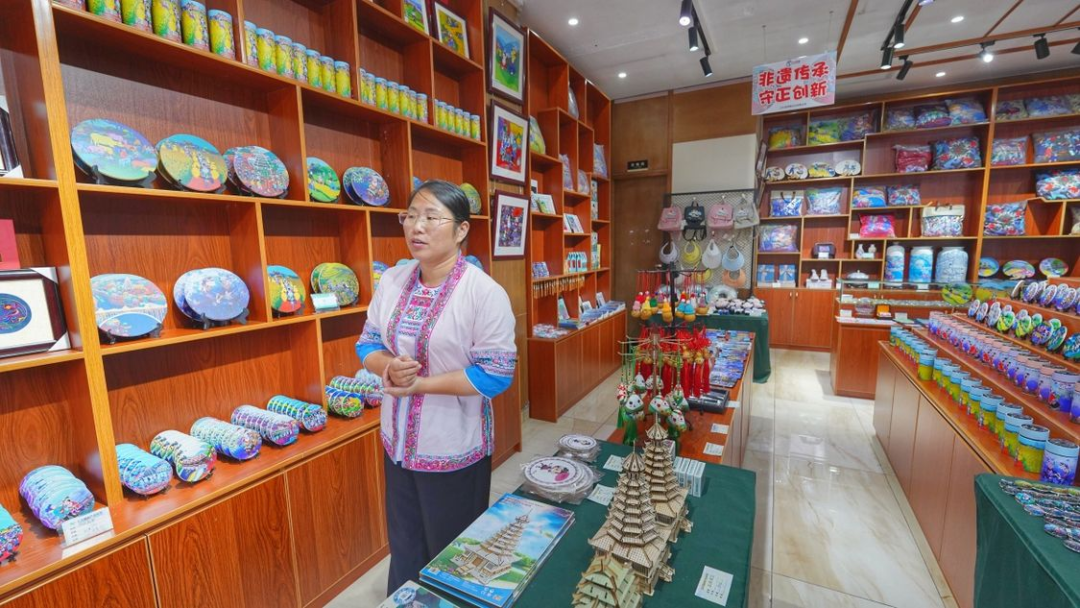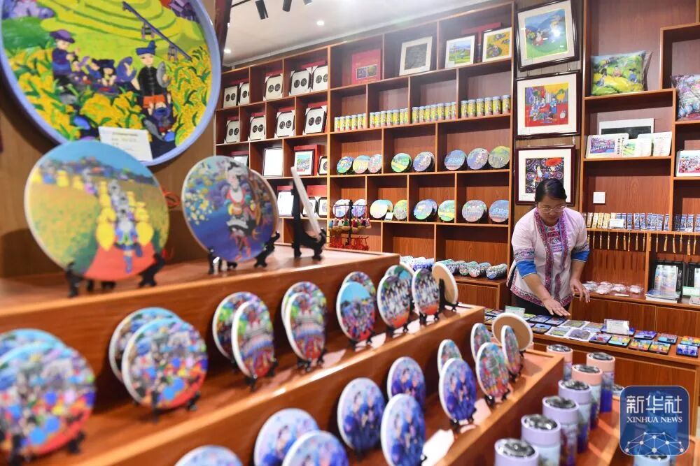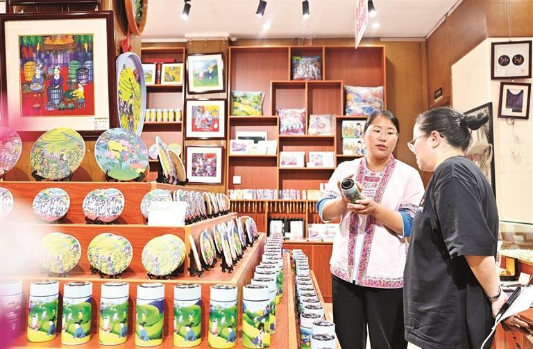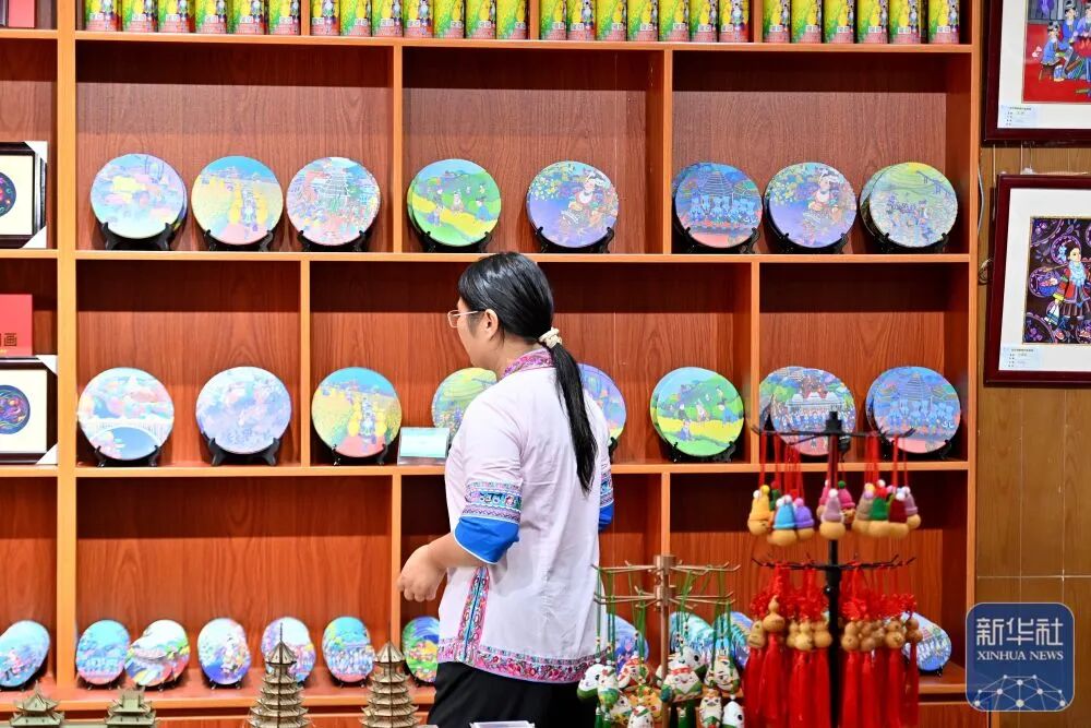 在广西三江侗族自治县一家非遗文创超市,侗族农民画作者在整理农民画文创产品。