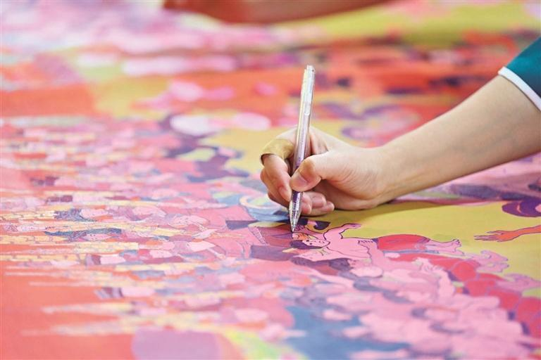 三江农民画作者在集体创作《侗乡百节》长卷。