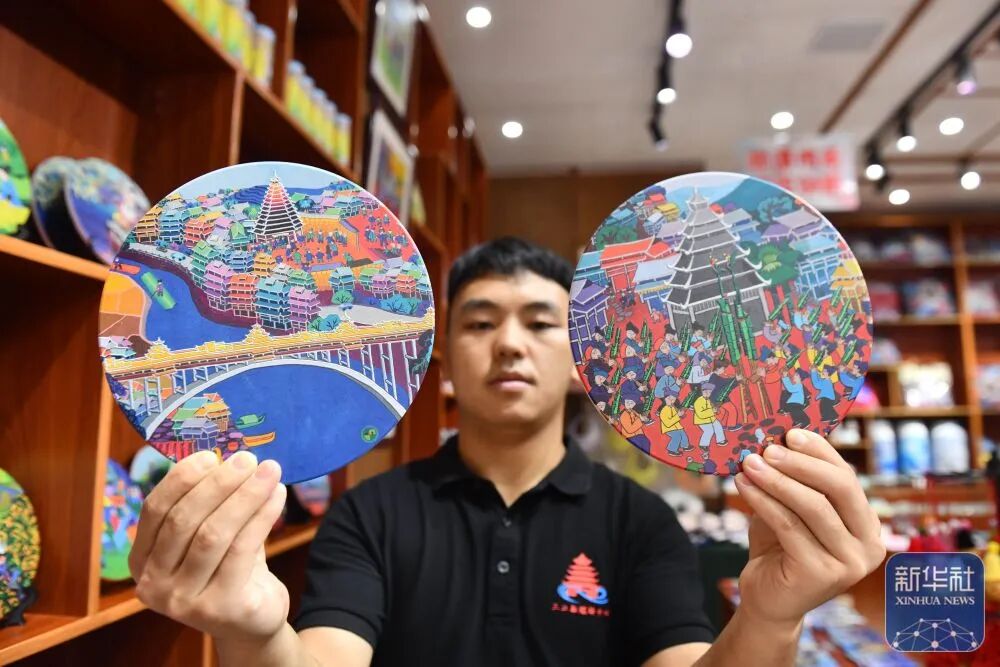 在广西三江侗族自治县一家非遗文创超市,市民在展示农民画文创产品。