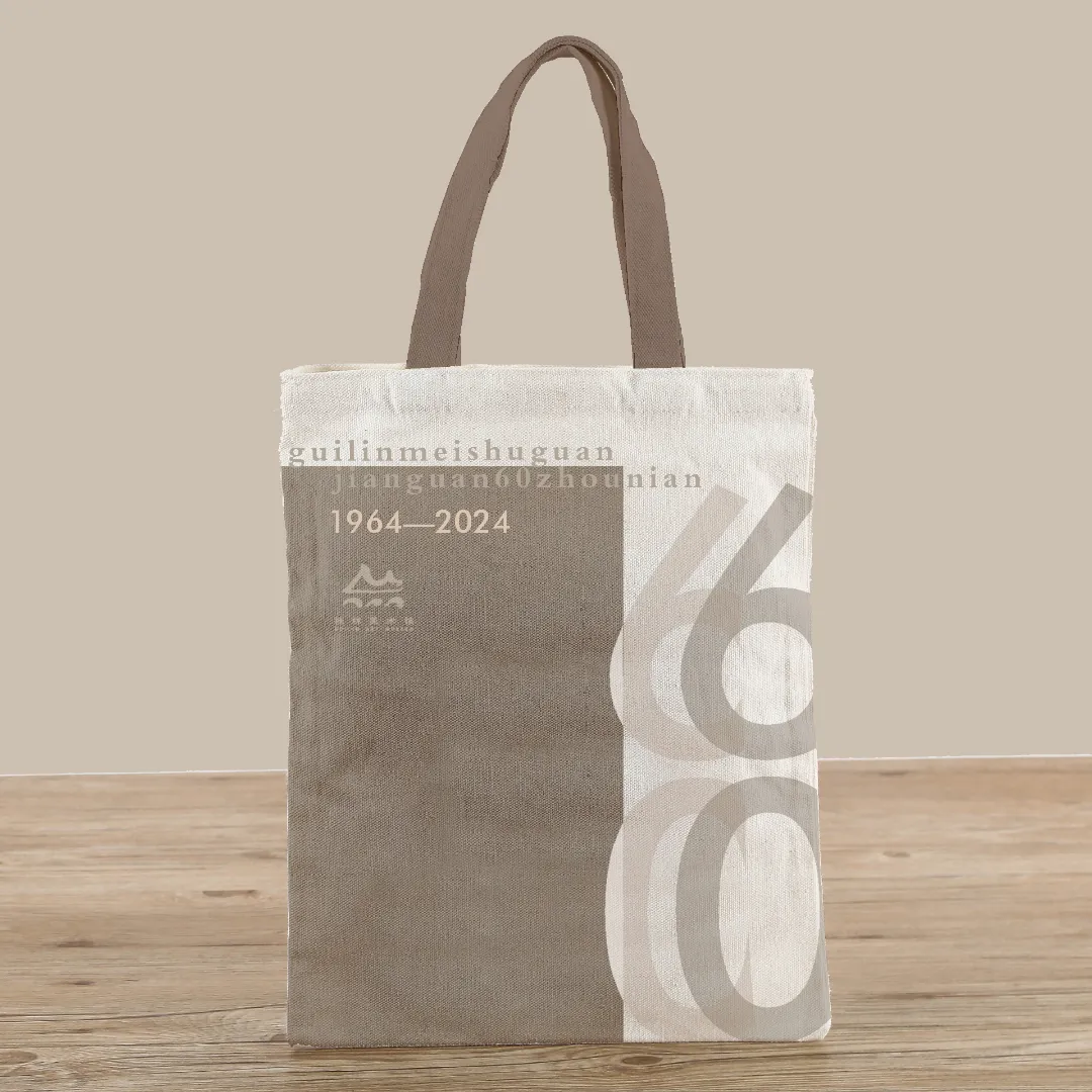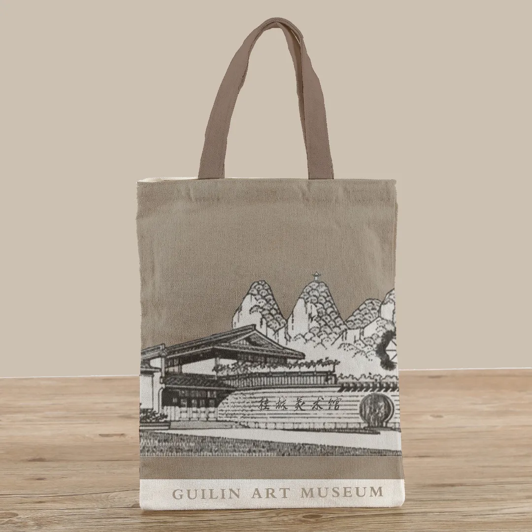 桂林美术馆手袋文创产品,正面选取了中国建筑教科书中桂林美术馆建筑手稿图为设计图形,背面为60周年庆的文字排版设计,排版上采用了非对称均衡的设计手法,同时将现代设计和传统手绘艺术结合在一起。设计以桂林美术馆作为创作主体,通过对传统文化元素与现代时尚风格相结合的形式来表现出一种具有深厚历史文化底蕴又富有时代气息的桂林美术馆的新形象。