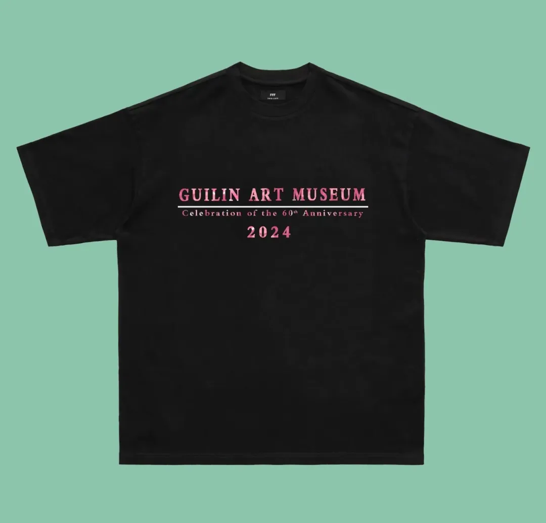 桂林美术馆短袖创意设计,选用了玫红色印花英文字母作为图形设计,简约中不失时髦,大色块选取黑色为基础,在文字中穿插白色线条,达到增强视觉冲击力的效果,设计以桂林美术馆作为创作主体,通过对“桂林美术馆”进行英译,让这件黑色短袖,以其独特的设计语言,诠释了时尚与桂林美术馆的完美融合。