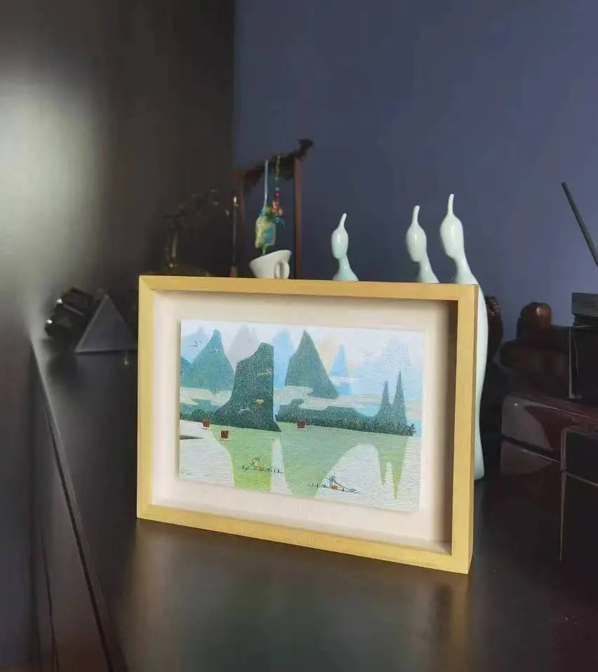 桂林美术馆宝石画文创产品,艺术灵感来源于姚奎先生在1964年完成的大型马赛克壁画《桂林山水歌》,因宝石材质本身晶莹剔透的质感及宝石画精致的镶嵌手艺与《桂林山水歌》作品本身的马赛克镶嵌工艺有异曲同工之妙,充分表现出《桂林山水歌》作品的清新素雅,秀丽动人。
