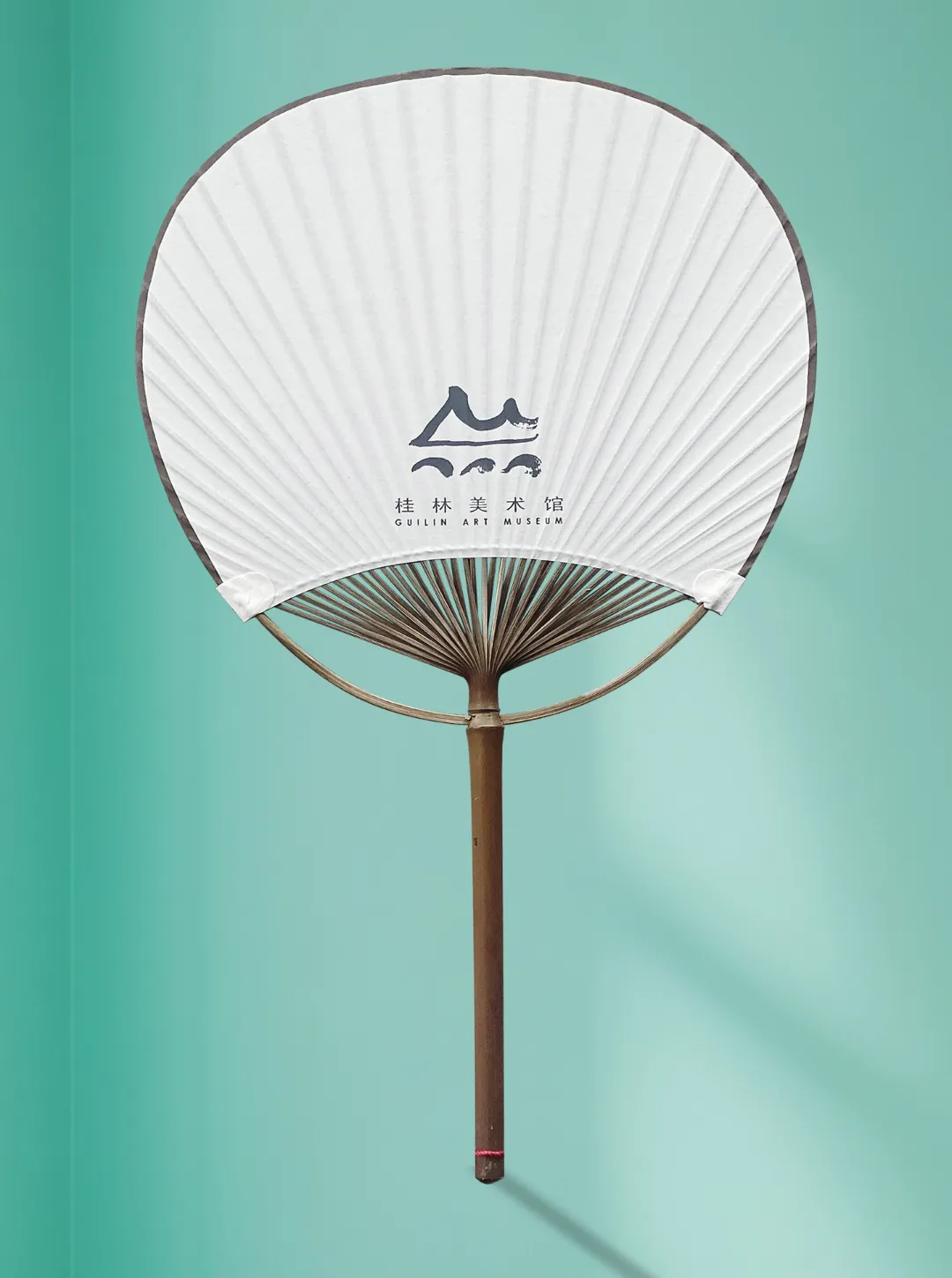 桂林美术馆团扇设计,选择了桂林非物质文化遗产圆竹剖丝团扇一体成型的工艺。扇面采用宣纸贴制,再经过扇面裁剪、包边,完成团扇制作。扇面单面印刷“桂林美术馆”的标志,标志简单明了,易于识别;背面留白,可供自由绘制图像。促进了传统与现代文化的对话与融合,将历史悠久的桂林美术馆与团扇组合进行现代设计的重新诠释,展现了丰富的艺术价值,延续了历史记忆。