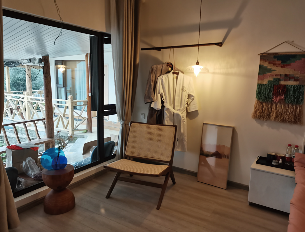 还有依山而建的木屋小院,位于海拔1314米的赵公山半山腰。院里的每一间木屋都是两室一厅,拥有绝佳的视野。