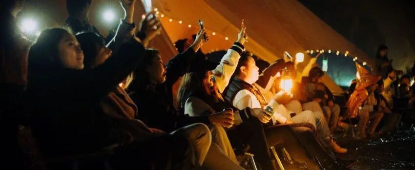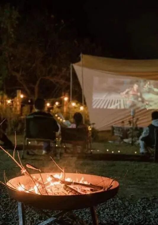 入夜,随着星星灯点亮、篝火燃烧,一群人的狂欢开始了,伴随着音乐、歌声,身体晃动摇摆,抛却万千烦恼。看一场极具氛围感的露天电影,围坐在氛围感满满的篝火之前,在这微妙的时刻,抿一口清酒,此时微醺,“醉”动你心!