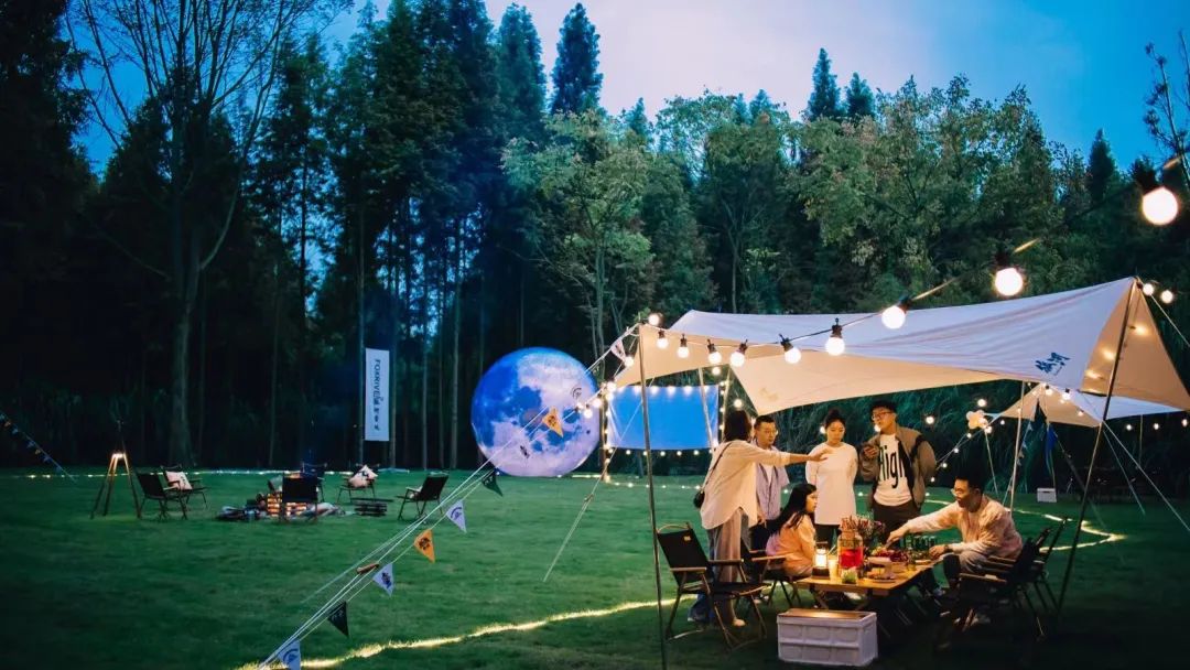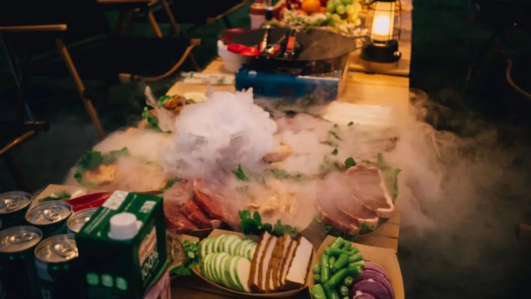露营地在打造最初,就秉持着这样朴素的愿景:破解生命与生态日益紧张的危局,理智地处理好生存与存在的关系,逐步回归人与自然、人与社会和谐共生的良性循环,达成诗意栖居的共同愿望。下午时分,宽阔的露营营地已搭好帐篷,摆好桌椅,鲜花和美食铺陈,气球和彩灯映衬。夜晚的露营地是活跃的、美丽的,缠绕在四周的灯带逐步点亮,营造出迷离微醺的氛围。美景悦目,美食则暖心。