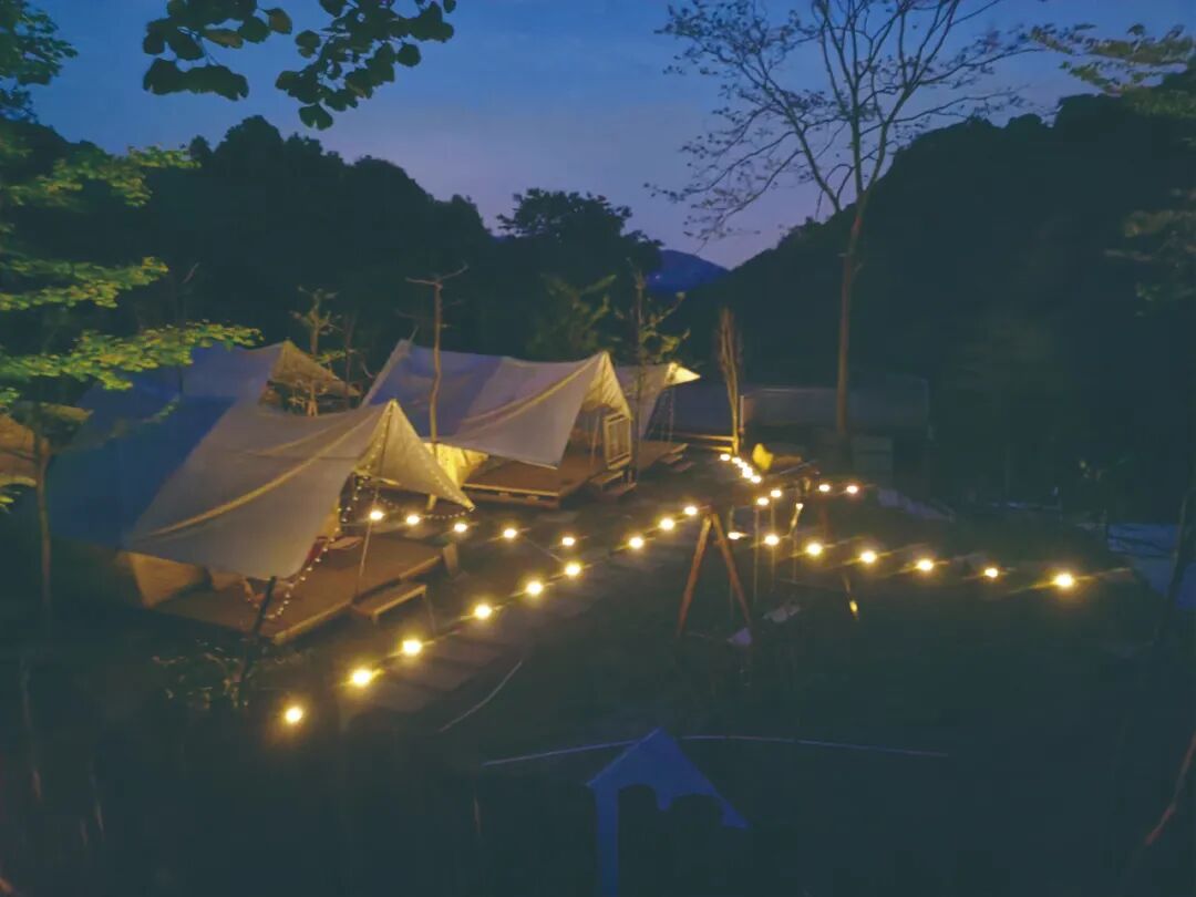 营地位于一片绿色森林之中,四周被密林溪流所环抱,清凉舒适、充满野趣。步入其中,一步一景,是与大自然的一场亲密约会,附近还有很多茶铺、咖啡馆、农家小院......夕阳下,炉子里跳动的火苗、烤盘上“滋滋”作响的五花微微卷起,脂香四溢,再来上一罐冰镇饮料,无不诉说着这个夏天的热情!困意来袭,就躲进帐篷中,肆意躺在软柔的大床上,以月光为被,林木为床。傍晚赏落日余晖,清晨感水雾弥漫,舒适又惬意。3、玩耍时请大家一定要注意安全,请勿擅自下河玩耍!
