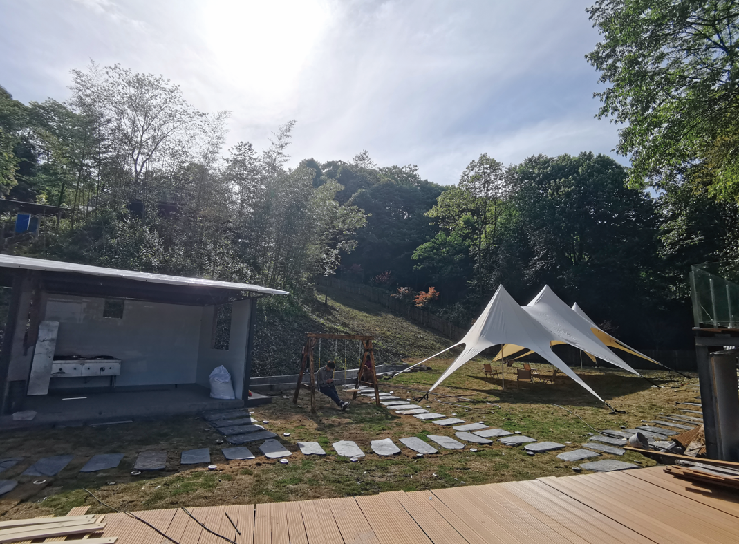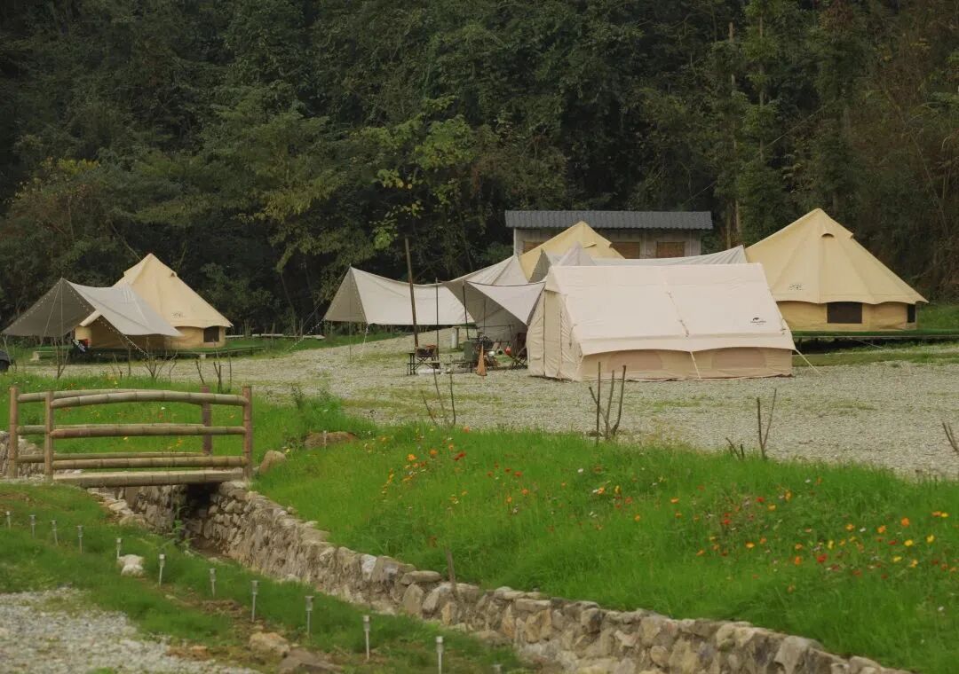 帐篷营地占地2000多平方米,目前有帐篷房5间,另可在草地或露台扎帐篷20余顶,一次性最多可接待80到100人的团队住宿。