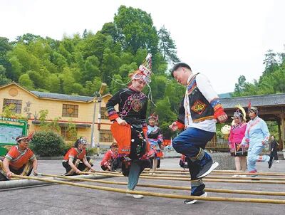 江西鹰潭贵溪市樟坪畲族乡位于大山深处,生态环境优越,该乡将畲乡文化与森林康养旅游结合起来,打造独具特色的畲乡文旅健康游,吸引了众多游客前来“打卡”体验。图为游客正与当地居民一起开心跳起竹竿舞。周 欢 张维民摄影报道