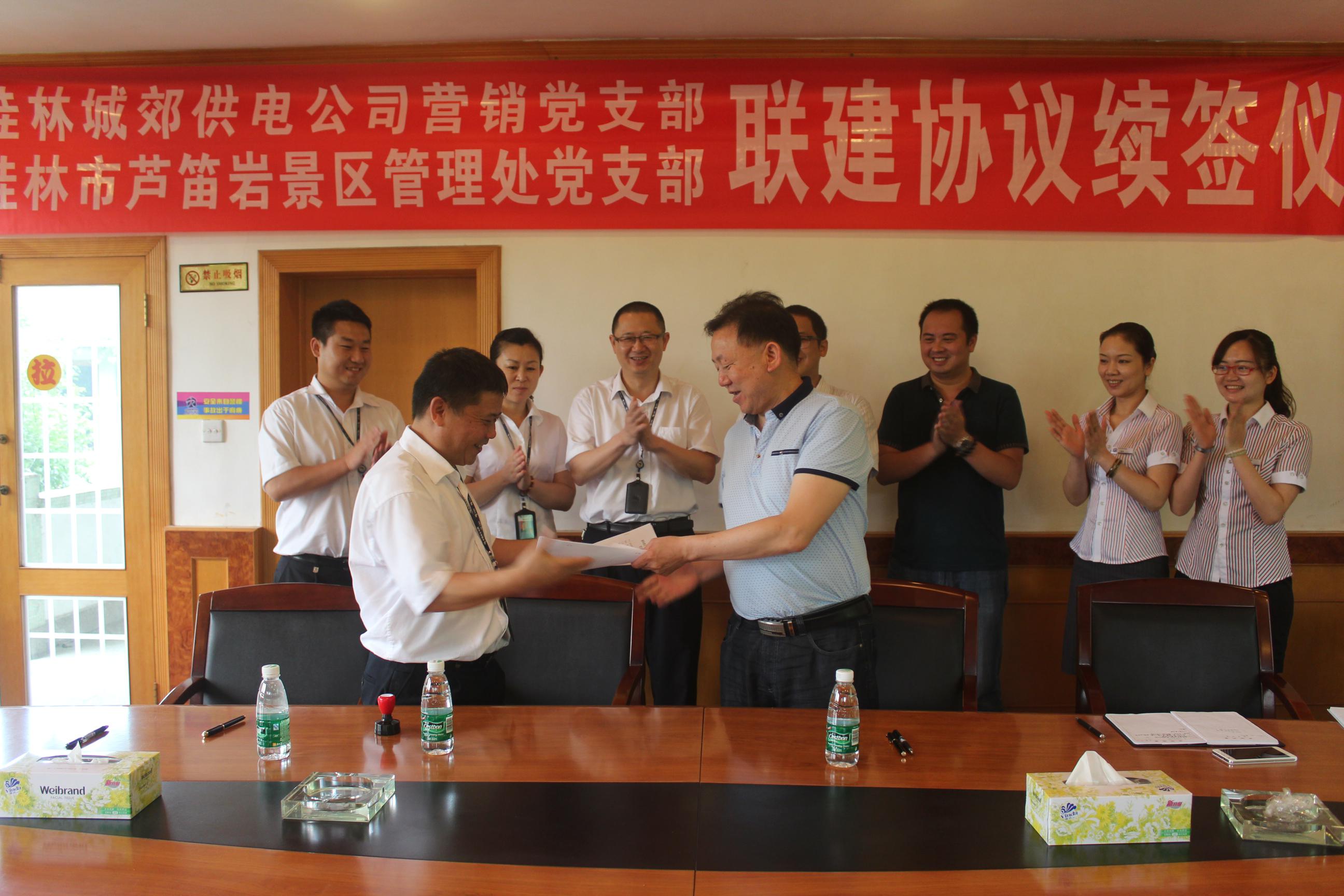 2015年5月27日,芦笛景区党支部与桂林城郊供电公司营销党支部联建协议续签仪式在芦笛景区管理处会议室顺利进行。——芦笛景区党支部与郊供电公司营销党支部开展“联建”活动