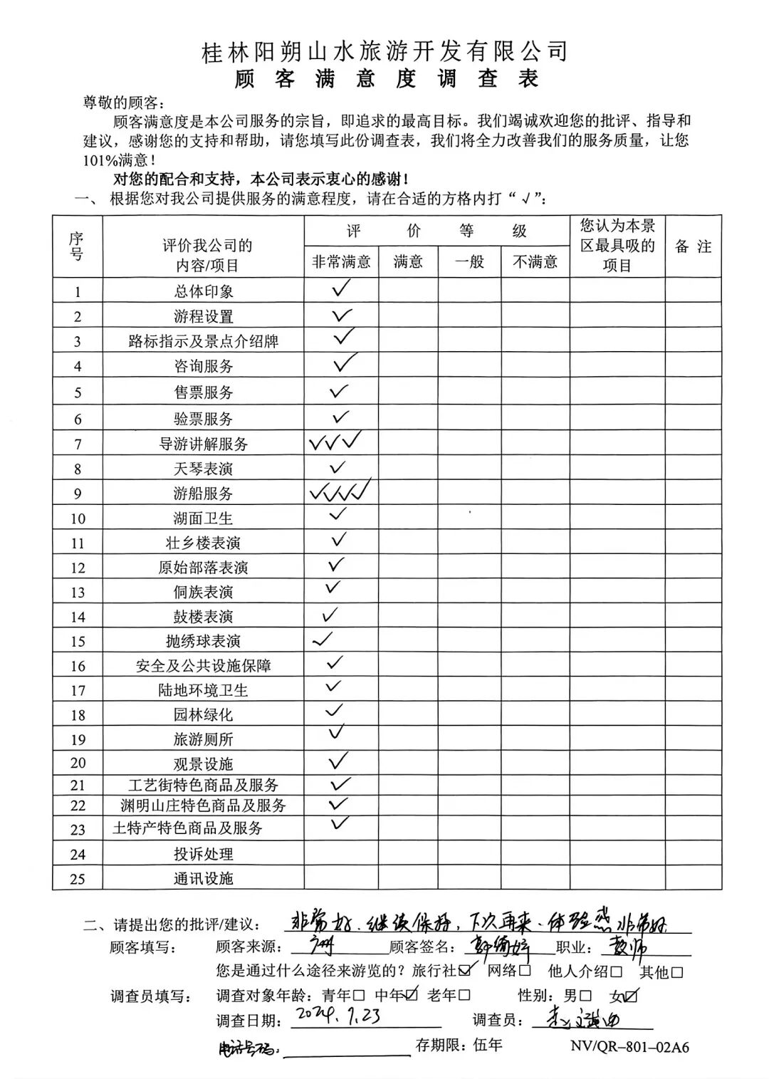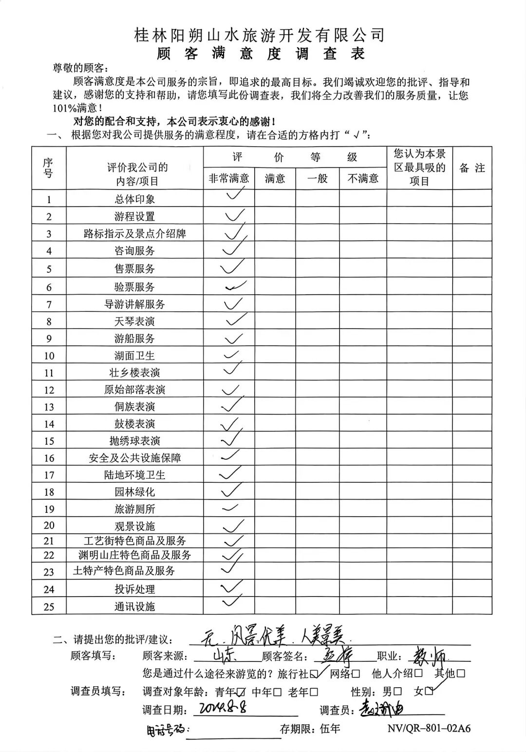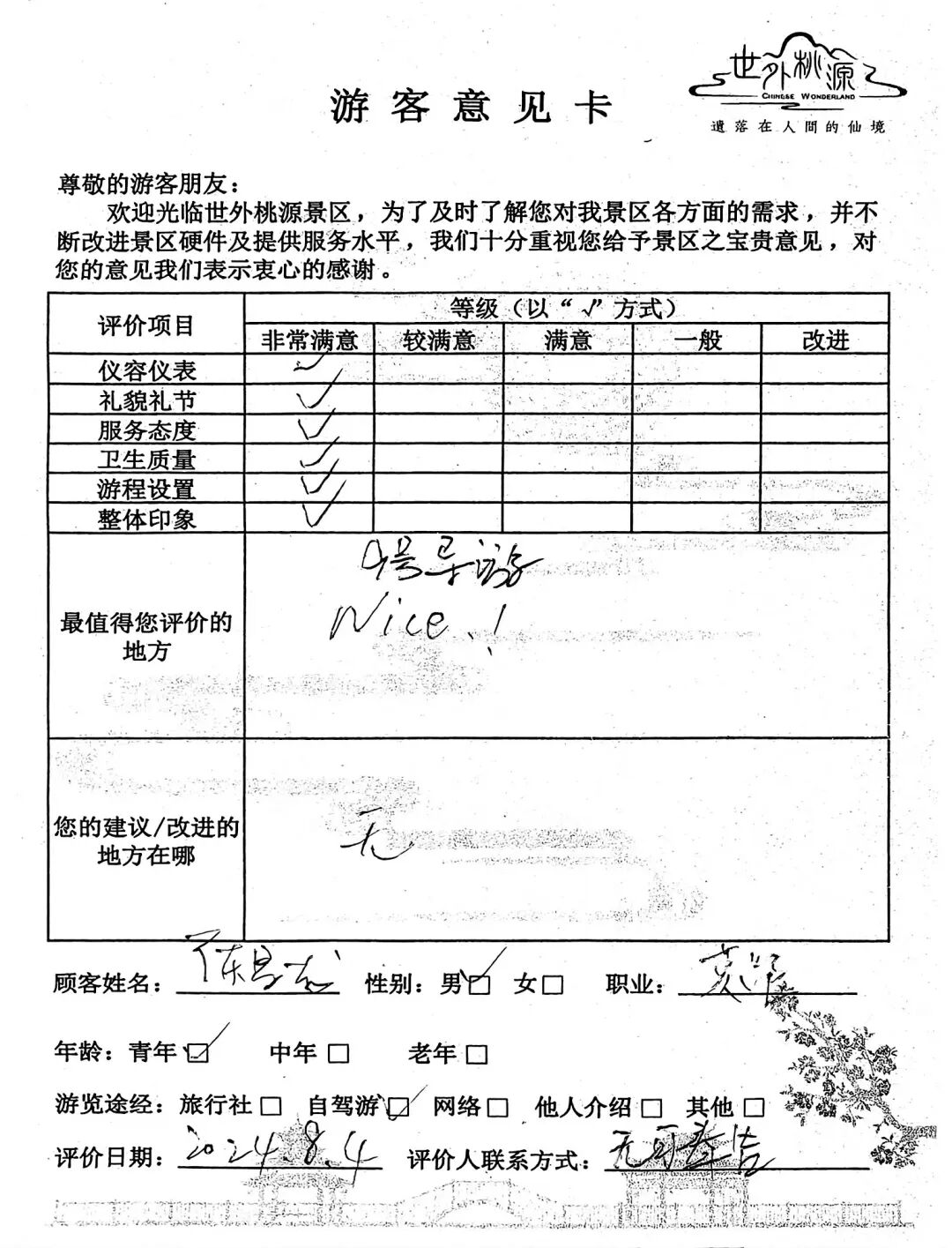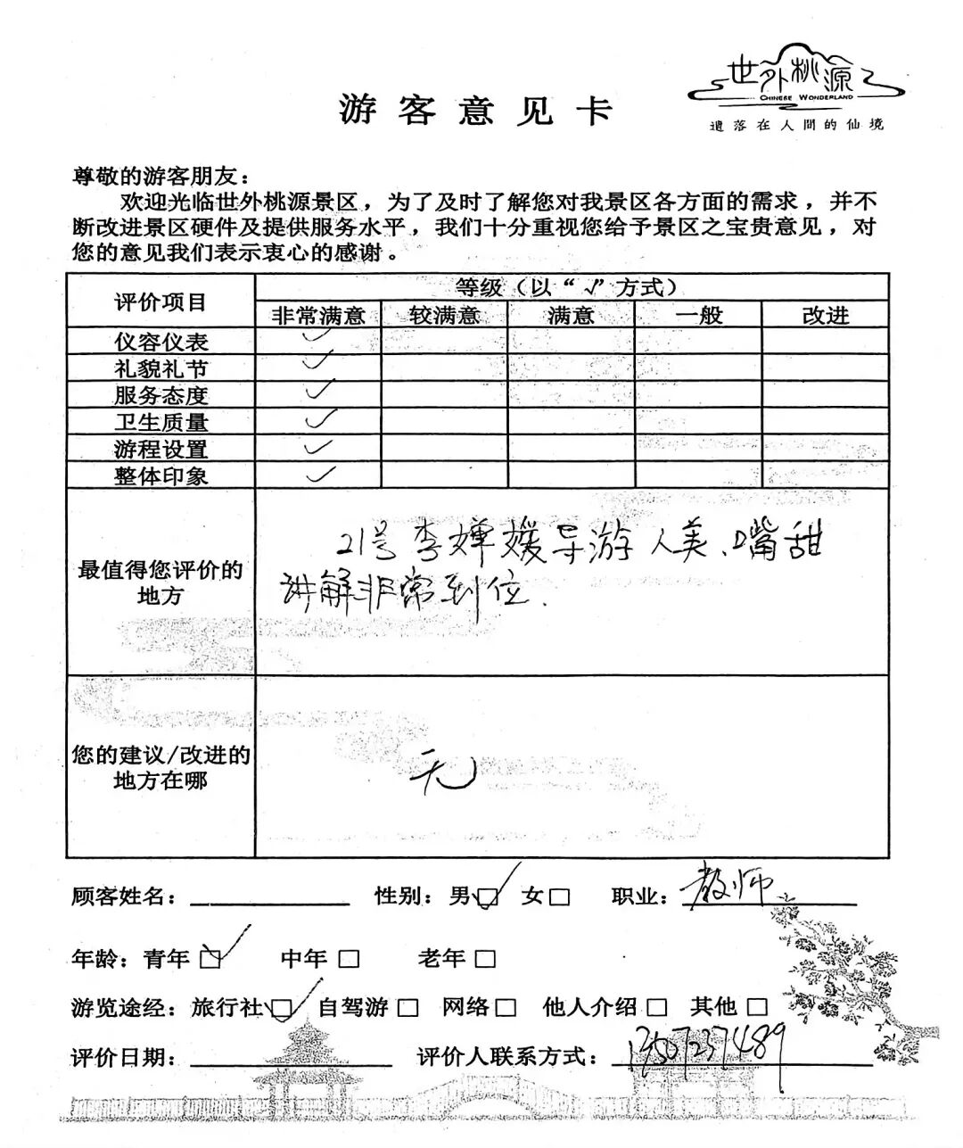 游客的意见卡和满意度调查表体现了景区工作人员的高尚品德和对游客的深切关怀,给游客带来了极大的便利和温暖。用热情好客、文明礼貌的良好形象,为景区增光添彩。