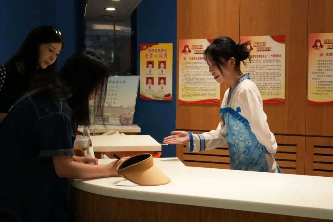 三伏炎夏,工作人员正温馨提示着身边的游客,耐心的咨询引导。