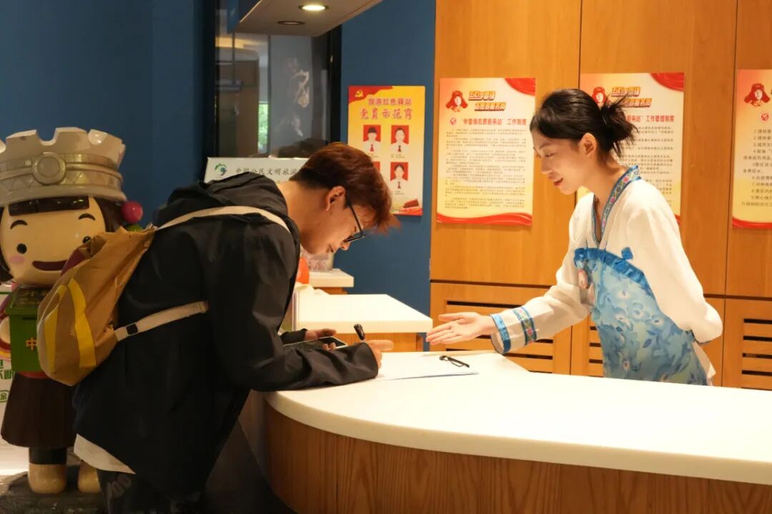 让游客“愉悦舒适”是工作人员最大追求。在面对面服务时,他们严格履行“一笑、二心、三声、四个零、五个一样”承诺,即:一笑,面带微笑;二心,解答游客提出的问题要耐心,解决游客遇到的困难要热心;三声,来时有迎声,问时有答声,离时有送声;四个零,服务受理零推脱、服务方式零距离、服务质量零差错、服务目标零投诉;五个一样,受理咨询一样热情,生人熟人一样和气,干部群众一样尊重,忙时闲时一样耐心,来早来晚一样接待。真正做到面带微笑、充满诚意服务游客,努力让游客感到“家”的温暖和热情。