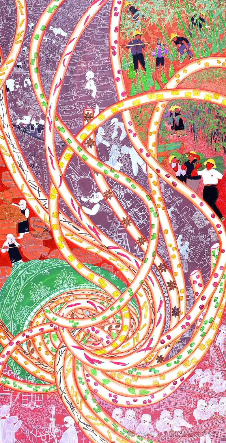 近年来,随着巩固拓展脱贫攻坚成果衔接推进乡村振兴的不断深化,广西农民画得到蓬勃发展。各族人民积极感悟时代之变,“白天提锄头、晚上拿画笔”,以民族风情、生产生活、乡村振兴为题材,画山、画水、画劳动、画丰收、画乡情,用画笔记录美好、记录感动。在自治区党委宣传部的指导下,广西书画院自觉以文化赋能助力乡村振兴,连续四年举办广西农民画大展,并深入基层开展公益培训、辅导活动,努力让人民群众成为艺术创作的主角,让农民画作拥有更广阔的展示舞台。目前,广西农民画作为一个具有生命力的画种,其参与创作的群体已经不仅仅是农民群众,还有不少专业教师、专业画家以及大批民族地区的中小学生都加入进来,广西农民画愈加焕发出勃勃的生机和活力。