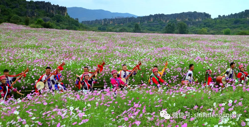 这里的石柱和石林风景区的石柱风格迥异,颜色黝黑古朴,造型体积更加粗犷豪迈,威严耸峙。它们比石林景区石峰少了一份精致,却多了一份混沌的力量和野性,穿行其间,峭壁巉岩,黑石森森,仿佛在与亿万年前的亘古巨人对话。每年春秋两季,乃古石林繁花盛开,深浅层叠、浓淡相宜的花海铺满大地,与灰黑色的石林、其他颜色的植物相融相映,清风掠过,花海起伏,唯美动人,一刚一柔的强烈对比,激荡起心中柔情浩气。