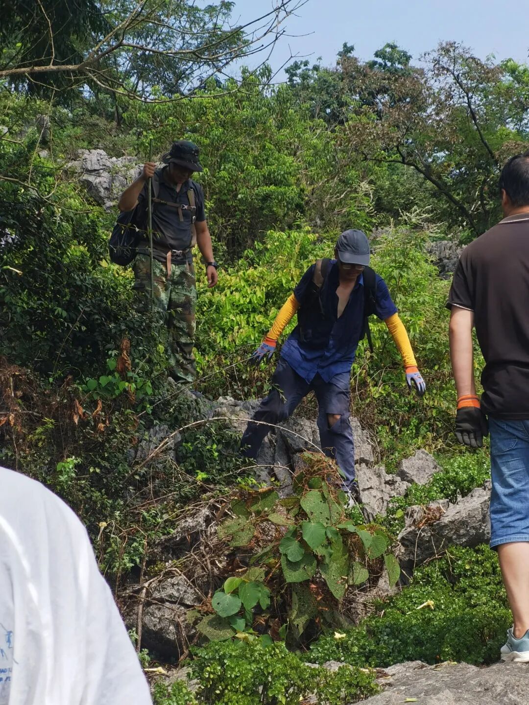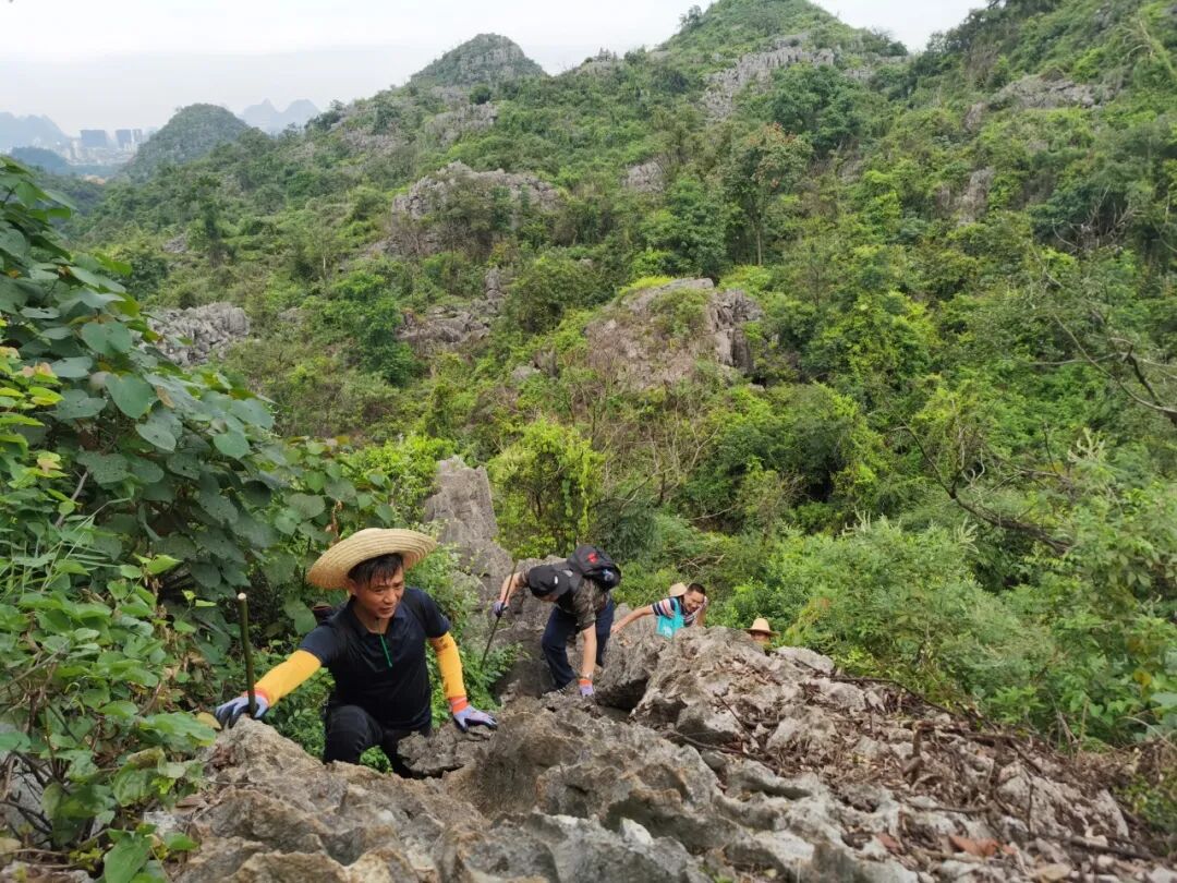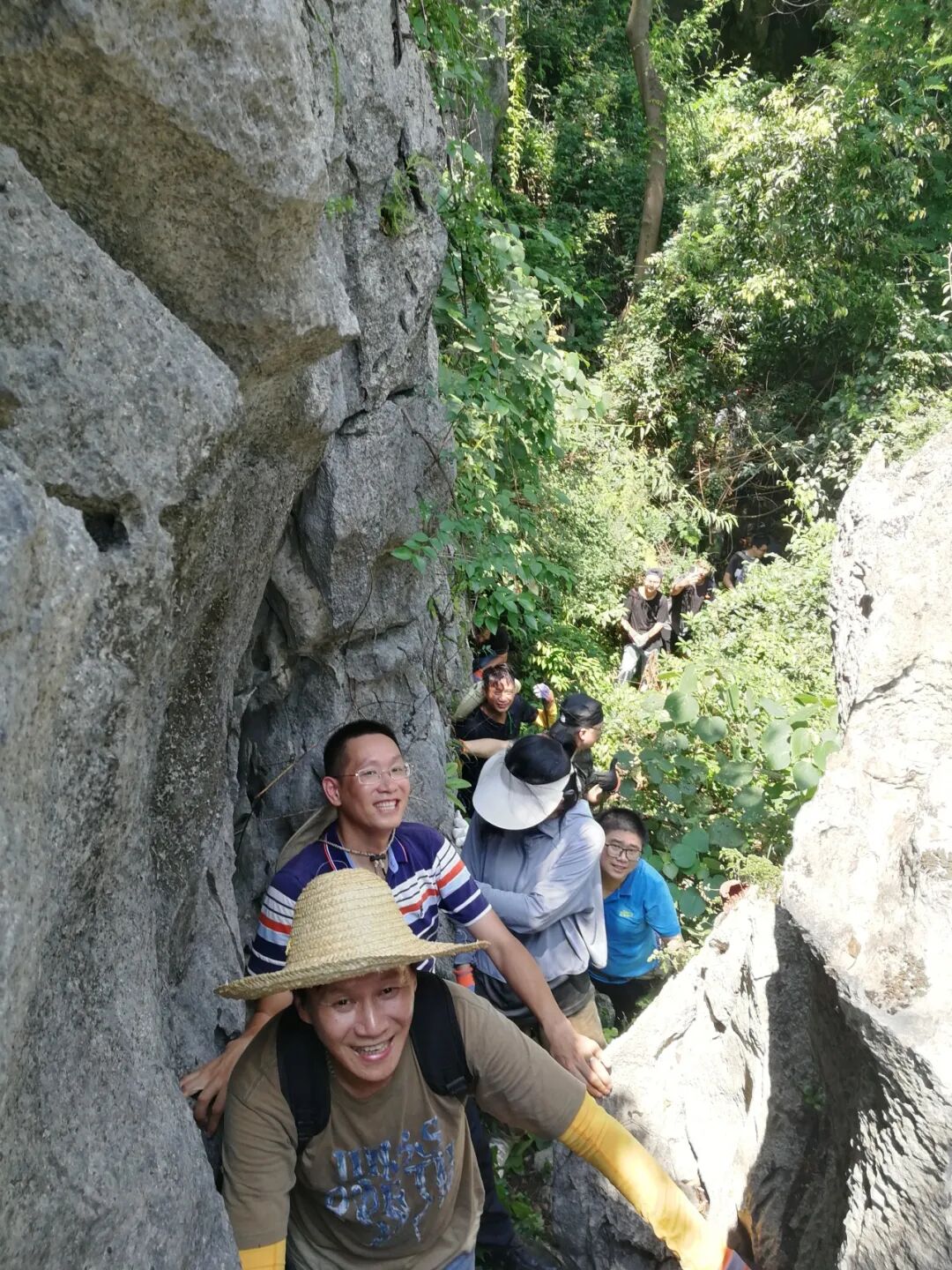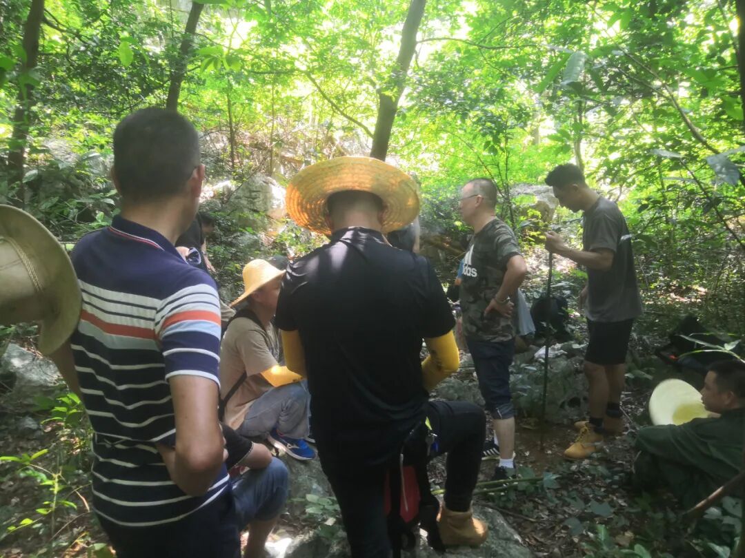 8月28日上午8点30分,调查队从景区办公区出发,队伍从普陀山南麓开峰始登山,经七星后岩一路攀登上普陀山忘忧峰(海拔277米,相对高度130米),从忘忧峰东面下到天坑底部,从天坑底部经“一线天”登攀到七星岩位于天坑中部的支洞洞口,最后从普陀山东麓下山到马艺城结束行程。整个行程中,同志们爬怪石、跨石沟、钻石缝,烈日当夕阳、荆棘当杜鹃,挥汗如雨、携手前行,表现出了“一不怕苦二不怕累”七星劲头,活动历时五个小时,达到了预期目的,圆满成功。