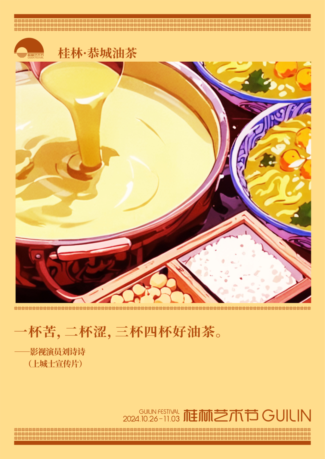 遇龙河畔油茶香,灯笼高挂,佳人乘舟而至。诗诗说:“和一座城一见如故,舌头和胃先知道。”油茶始于唐代,过去,南方山区多瘴气,而油茶具有消食健胃、祛湿避瘴的功效。捶打是油茶的灵魂,一口小铁锅,放油烧热,再将茶叶、生姜、花生、蒜等食材入锅稍炒、捶打……打好后配以米花、脆果、艾叶粑等佐茶小吃,别具风味。