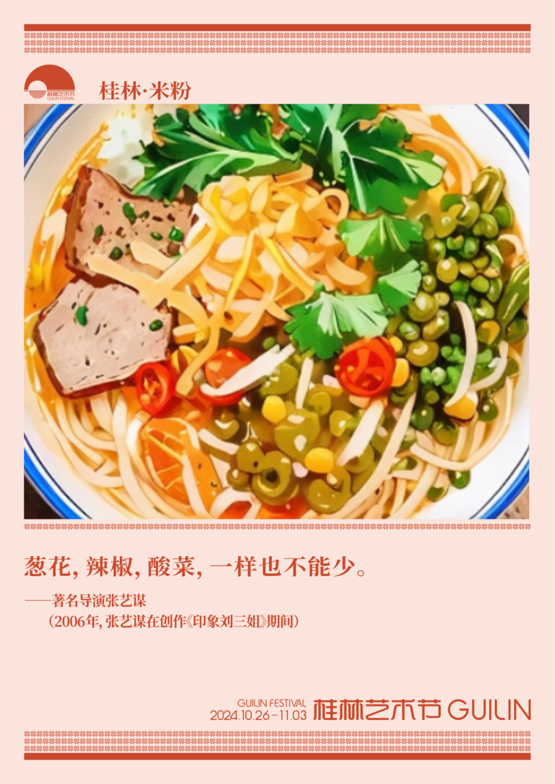 张艺谋吃桂林米粉很在行,米粉端来,葱花、辣椒、酸菜都来一点,吃完粉后慢慢喝汤,这也是最地道的桂林吃法。桂林最常见的嗦粉姿势:边走边嗦、站着、蹲着、趴电动车上……在那些时不时蹦出一两句桂林话的米粉店里,你能遇见最市井最有趣的灵魂!