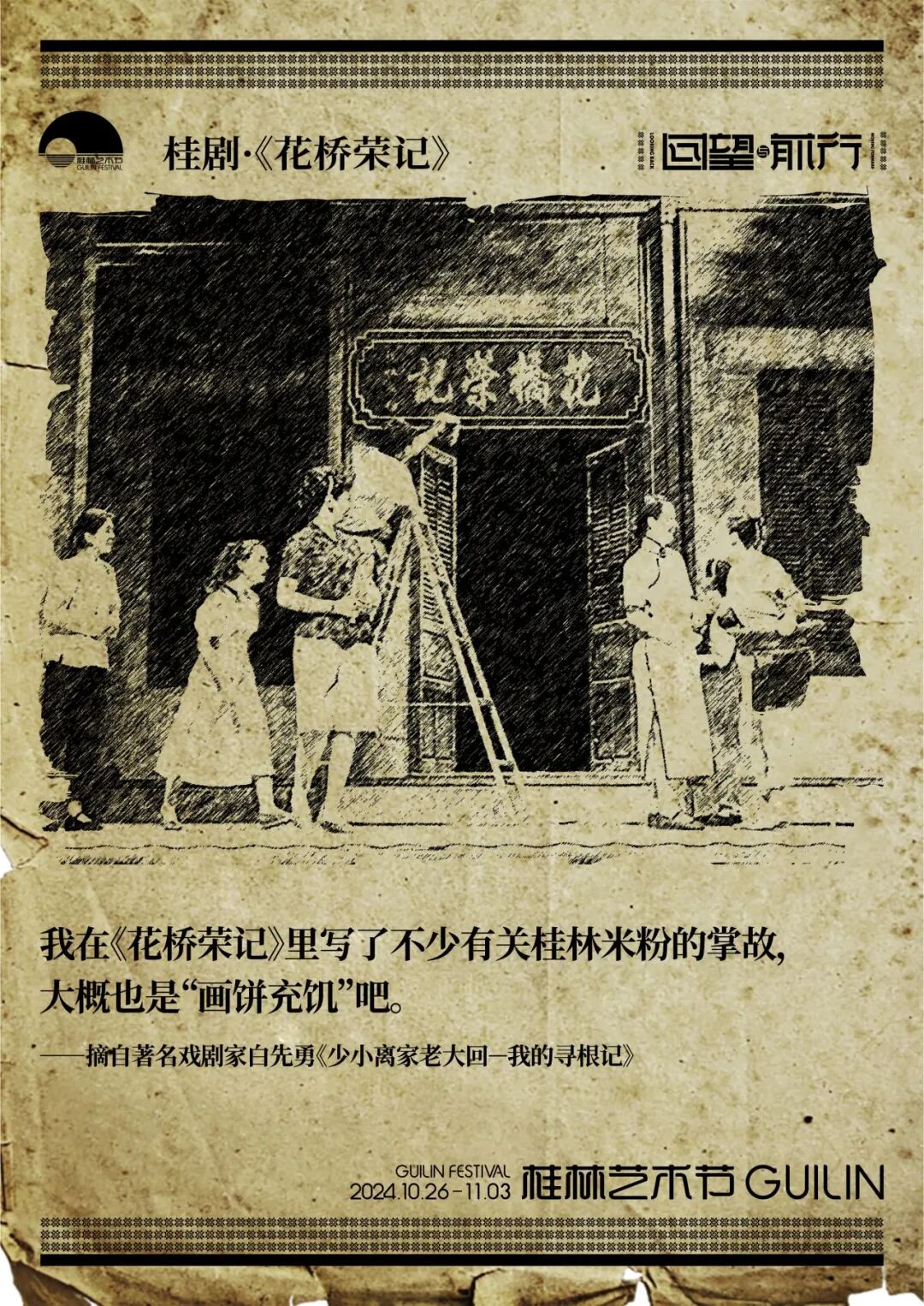 《花桥荣记》是剧作家张仁胜根据白先勇先生同名小说改编的话剧,讲述桂林人春梦婆在台北开老字号花桥荣记米粉店的故事。演出过程中,桂林元素得到了诗意的表达,花桥、漓江、桂剧、桂花等桂林文化符号推动着人物情感通向戏剧高潮。老板娘、李半城、覃癫子、卢先生、陈师傳等人他们将前半生的故事遗留在了广西,如今只能在台北的“花桥荣记”惺惺相惜,抒发着思念和追忆……这部剧在不少广西观众眼中,已成为桂林的文化符号。