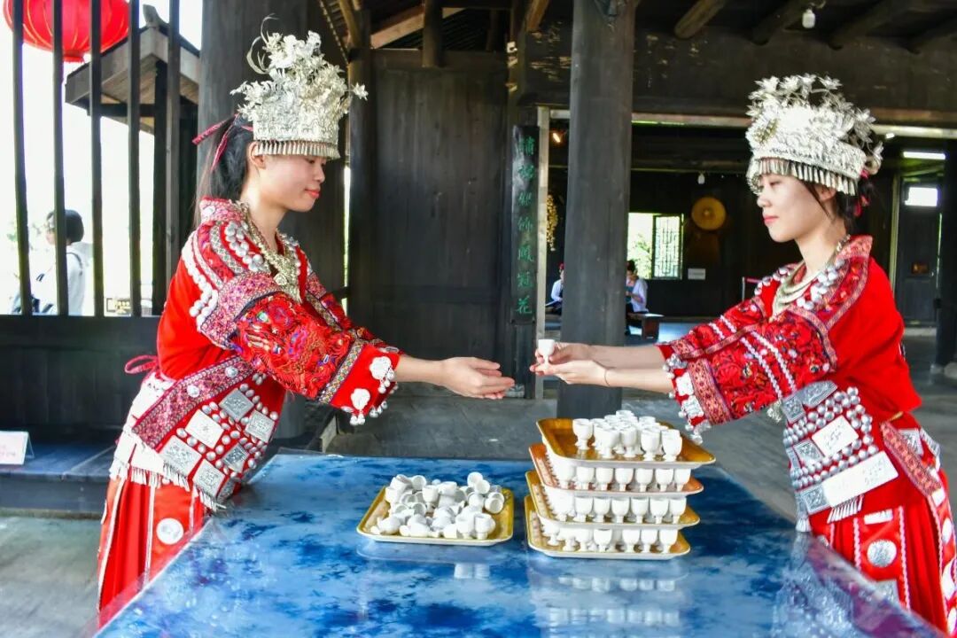 侗族姑娘们衣着盛装在寨门备好香醇美酒,夹道欢迎游客的到来,以“酒”拦路,以酒接客,以酒待客,以酒表心意,以酒作为最高最隆重迎宾。