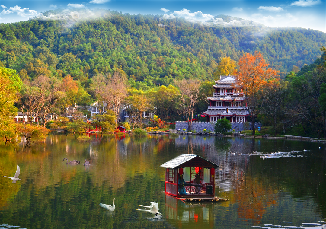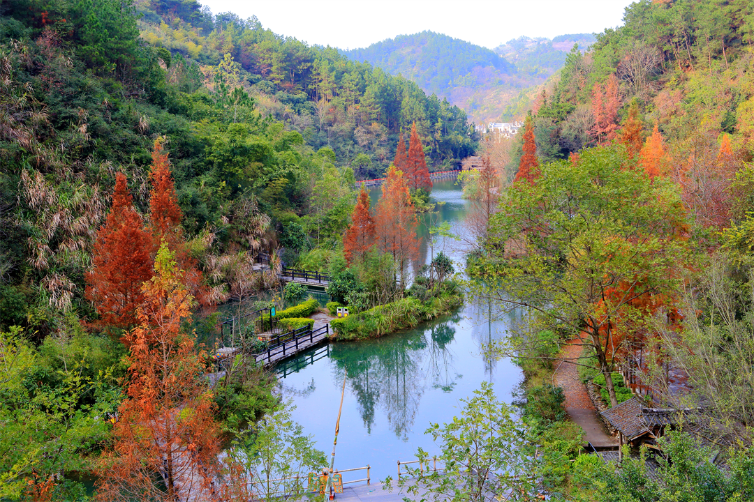 山,林,溪,湖构筑了逍遥湖的整体景观。逍遥湖、逍遥楼,历史古建和自然山水相得益彰。沿着峡谷溪水,逆流而上,古木参天,树叶被秋天渲染出绿色、黄色、红色层叠的色彩,大口呼吸都是负氧。