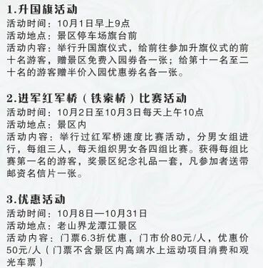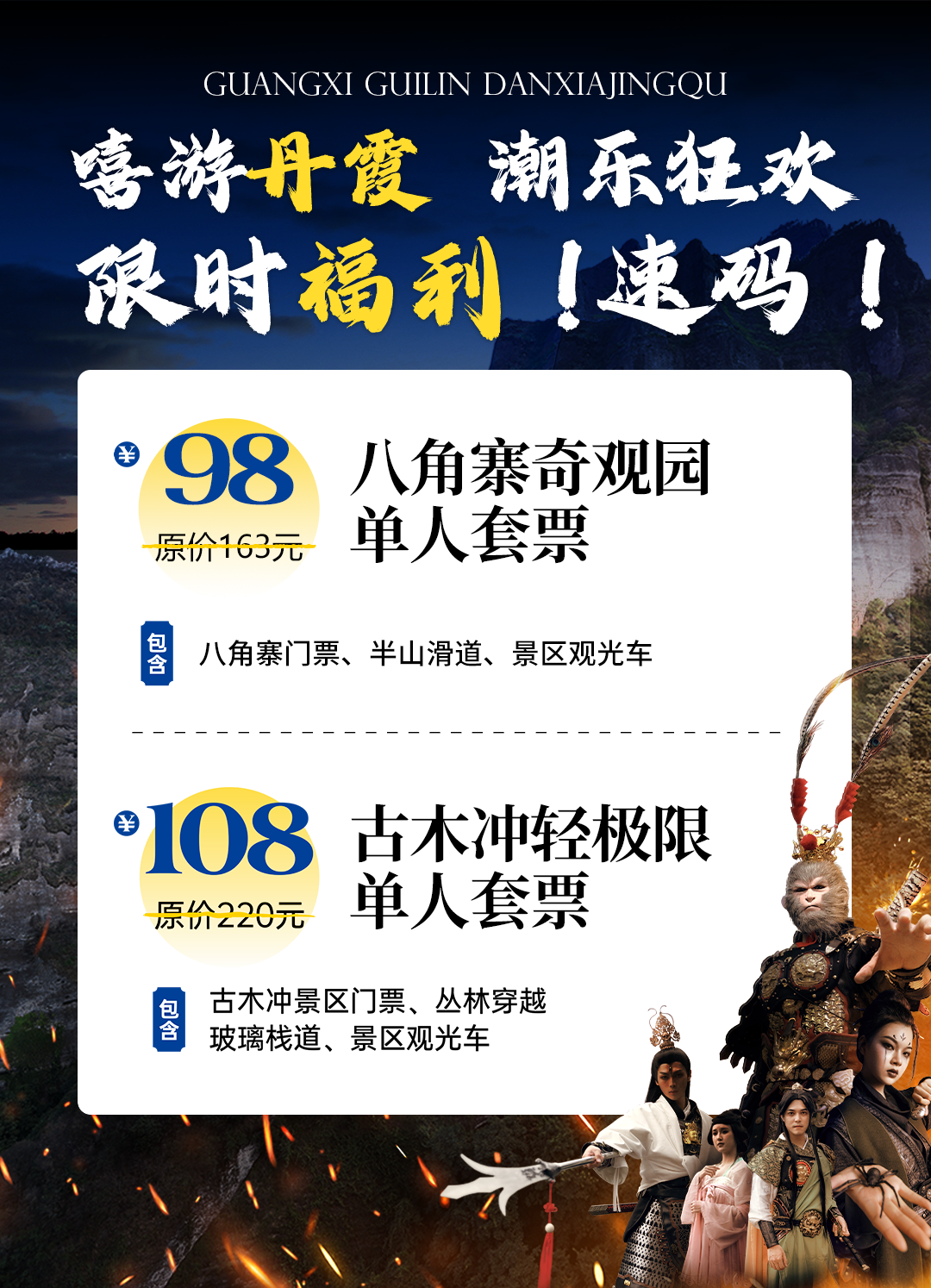 县城在国庆期间也是火力全开,美食、农特产品展、啤酒节、篝火狂欢、赏花灯、资江夜游……目不暇接的活动,足够多留住你一天!活动时间:9月30日-10月7日 09:00-22:00活动时间:9月30日-10月7日 9:00-22:00活动时间:10月1日-10月7日 10:00-11:30(每天一场)活动时间:9月30日-10月7日 9:00-22:00活动时间:10月1日-10月7日 20:00-21:002024年全国漂流全民健身活动(资源站)暨首届资源漂流公开赛活动时间:10月1日-10月7日 11:00-22:00如此大阵仗,“悟空”也来凑热闹。黑神话cosplay国庆将在八角寨陪同游客,一同饱览丹霞大好风光。还为大家准备了“集景区纪念章”的支线任务,边打卡边集章,太懂时下年轻人的心啦!白天爬山,夜晚涧谷露营,乐队现场驻唱,还把电影院搬到崖壁之上,星夜狂欢不停歇~1.八角寨双人下午茶:门市价324元/套,活动价188元/套产品含:双人八角寨门票(128元*2,含半山滑道、观光车)、双人下午茶套餐(68元,含水果1份、糕点2份、饮品2份)2.八角寨门票:门市价163元/套,活动价98元/套产品含:八角寨门票(100元)、滑道(38元)、观光车(25元)3.古木冲门票+丛林穿越:门市价220元/套,活动价108元/套产品含:古木冲景区门票(100元)、丛林穿越(80元)、玻璃栈道(15元)、景区观光车(25元)中峰漂流位于资源县中峰镇,距县城12公里,漂流全程长约5公里,游程约90分钟,是一项自助型休闲娱乐亲水的皮筏艇漂流活动。