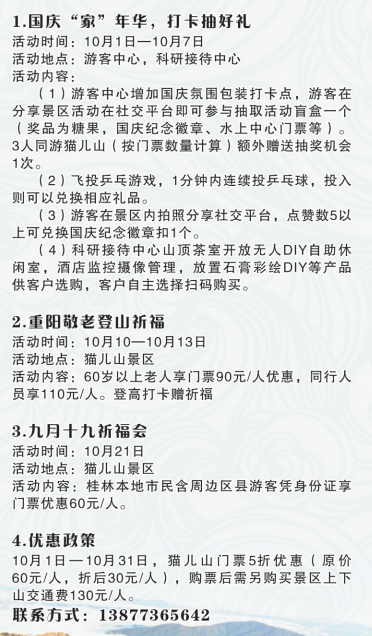 《印象·刘三姐》,近2平方公里水域与12座山峰作为舞台的辽阔;纯自然的山光水色、月明星辉与现代化灯光声电合作造就的澎湃;四季流转中,当地少数民族的诗意生活,在山水之中天人合一的原生演绎。活动内容:庆国庆佳节,【刘三姐文化印象博物馆】今年首次免费对外开放如意峰景区,有奇特瑰丽的喀斯特峰林山水资源、深远丰厚的如意祈福文化底蕴、独具特色的壮乡民族风情,是一个集缆车观光、观景平台、如意索桥、如意云顶、林中漫步道、玻璃栈道、数字体验馆等创意景观为一体的自然风光旅游目的地,充分满足游客多元化、个性化游览需求。