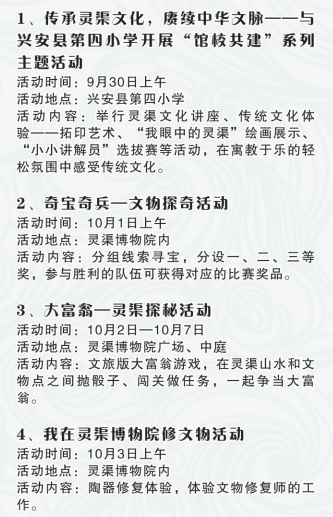 为纪念湘江战役90周年,园区在国庆期间举办了系列活动,弘扬长征精神。1.纪念湘江战役90周年系列活动——用彩泥塑英雄;2.纪念湘江战役90周年系列活动——红领巾讲解员讲党史故事、红色故事;3.纪念湘江战役90周年系列活动——“追寻红色记忆熔铸民族之魂”书法展。