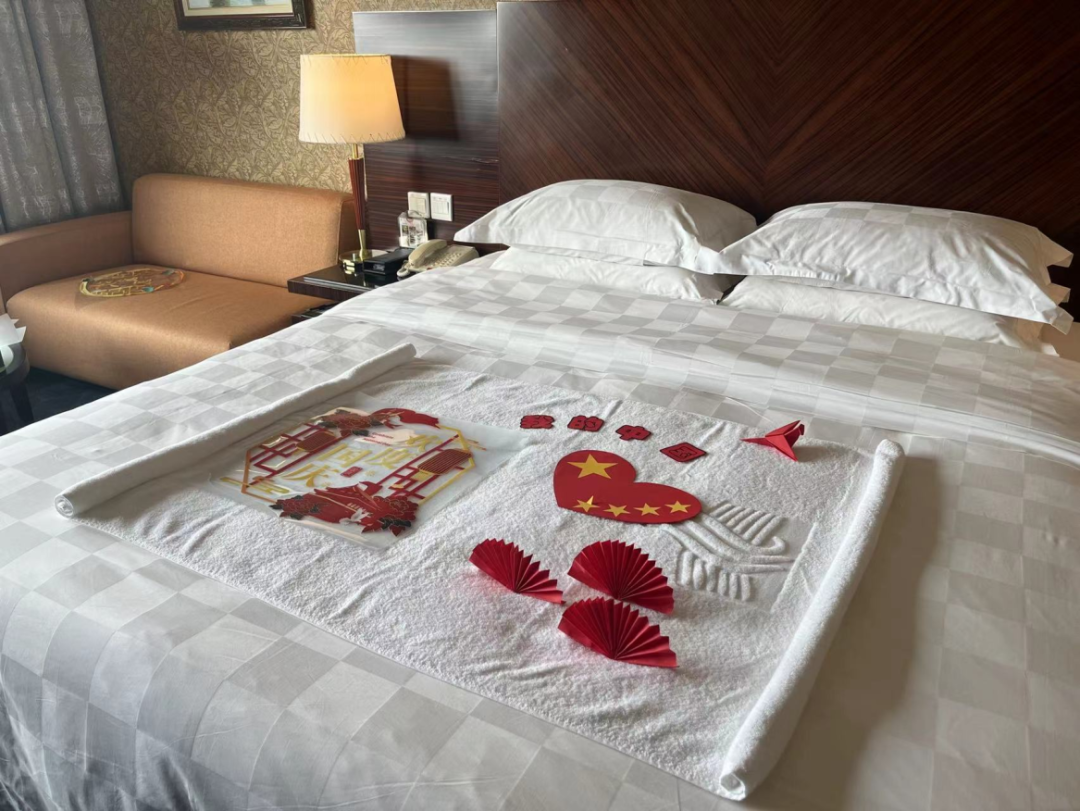 ▲大瀑布饭店客房部精心准备的国庆主题夜床设计