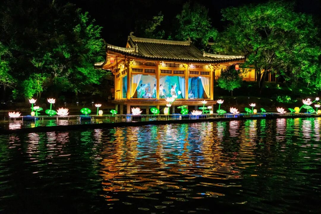 夜幕降临,景区特别布置的手绘花灯、锦鲤鱼灯、国旗灯、水上荷花灯等诸多花灯,吸引了众多游客驻足观赏,将节日氛围拉满。